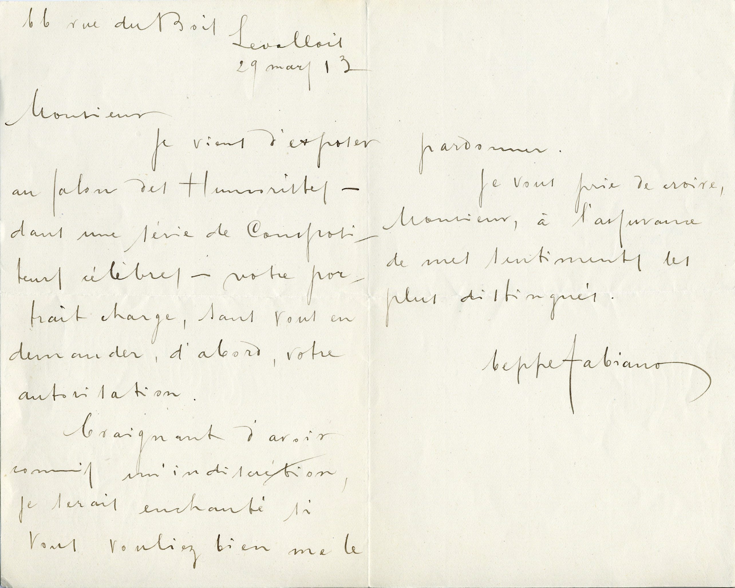 An autograph letter from the caricaturist Beppe Fabiano (Paris, May 29, 1912, 2 pp.) confesses to Debussy that "I have just exhibited your portrait at the Salon des Humanistes -- in a series of celebrated composers -- without asking your permission beforehand. Fearing I may have overstepped, I would be delighted if you would forgive me."