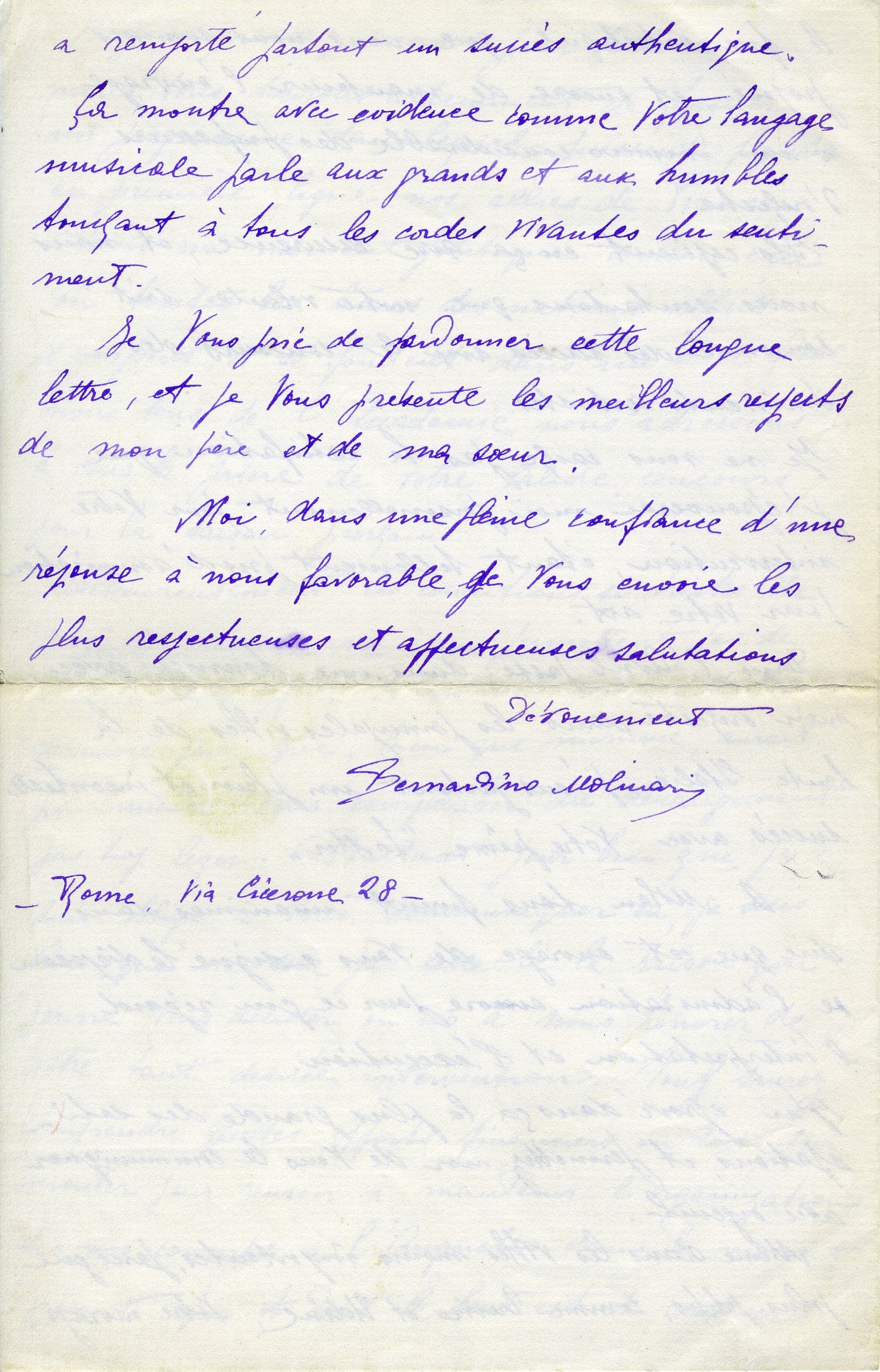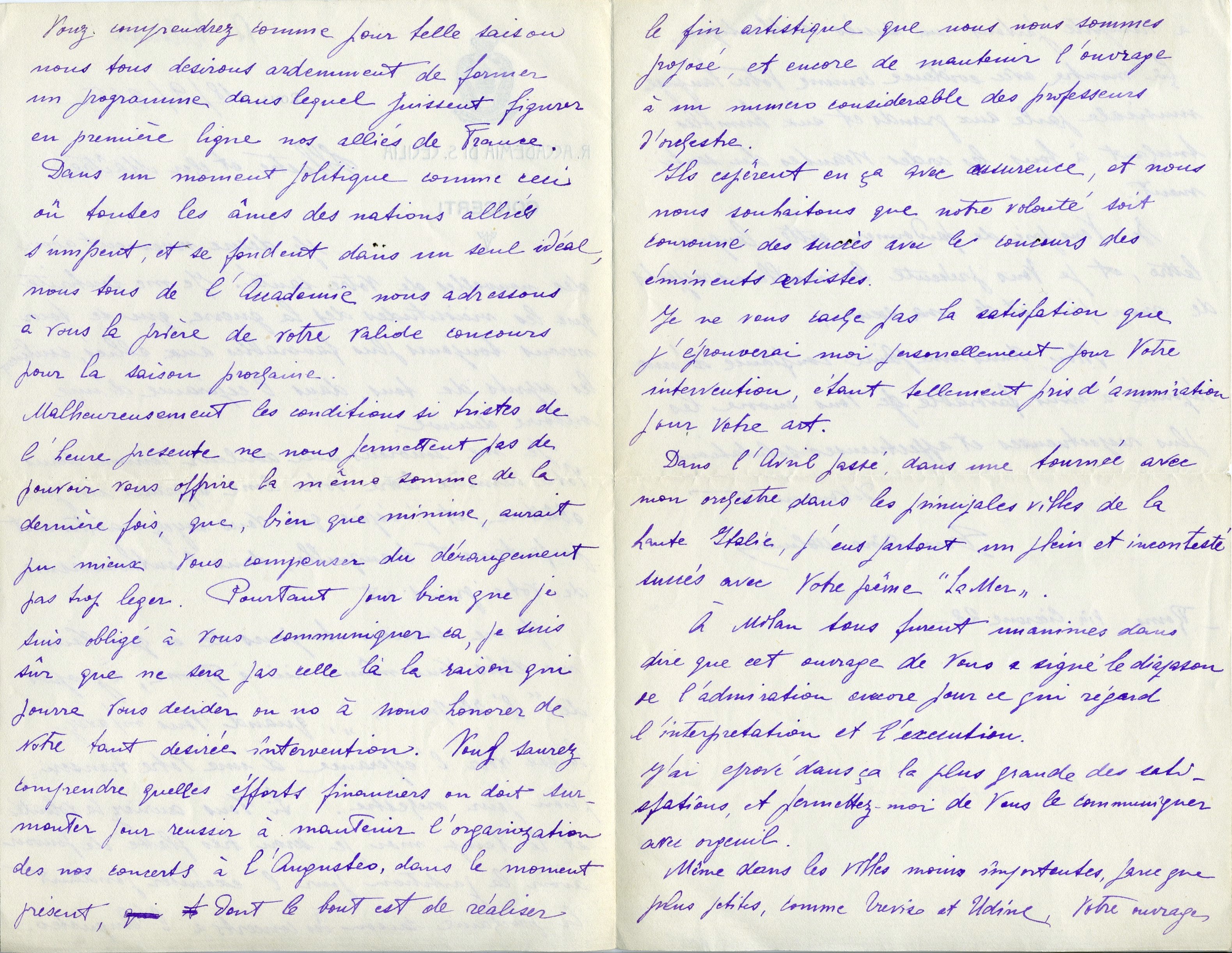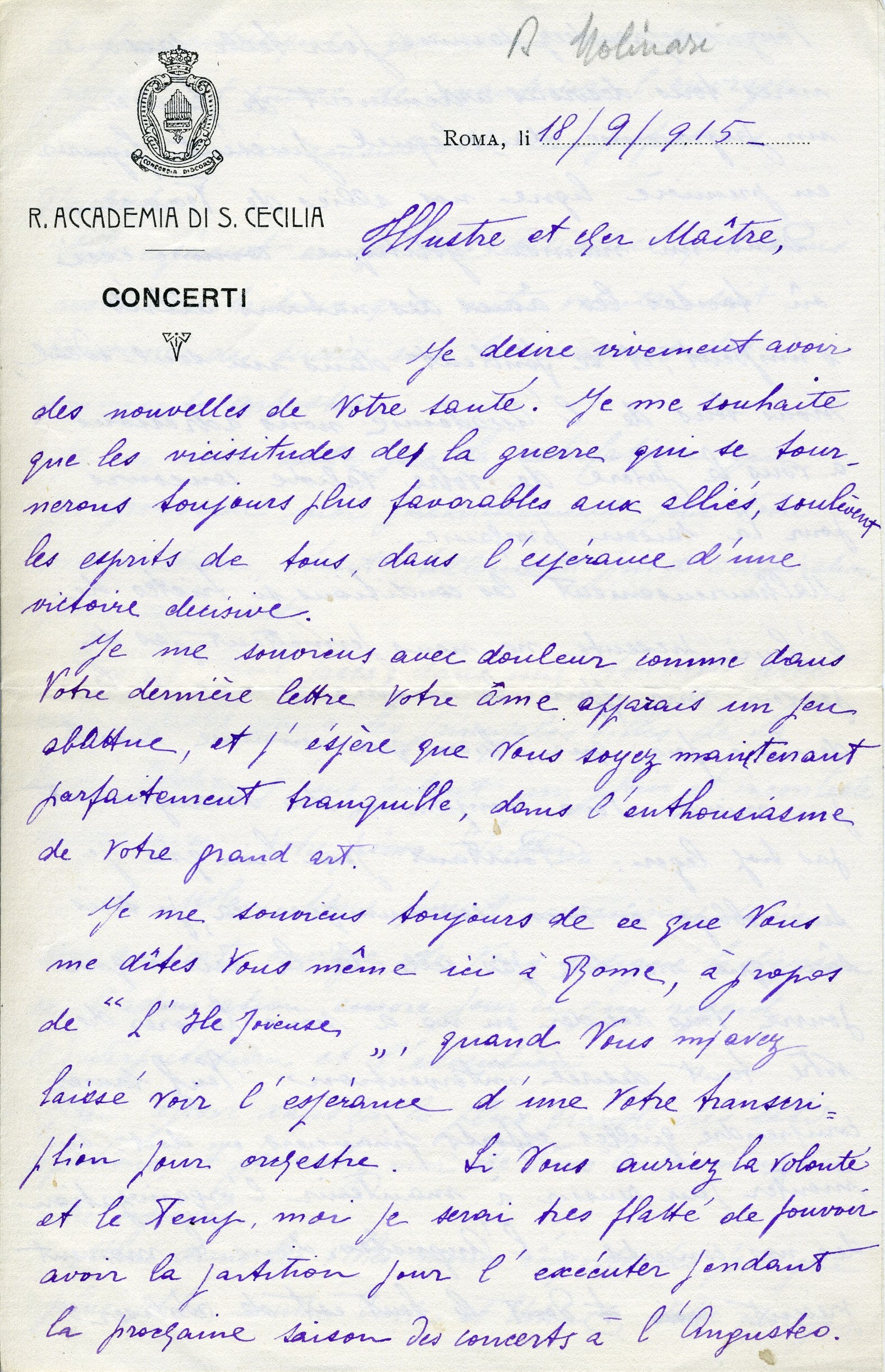 An interesting wartime letter from the Italian conductor Bernardino Molinari (Rome, September 18, 1915, 4 pp.) calls on Debussy's patriotic feelings to ask him to collaborate with his orchestra: "I still remember what you said to me yourself here in Rome, about "L'isle joyeuse," when you gave me hope that you might make a transcription for orchestra. If you have the desire and the time, I would be very flattered to have the score, to perform it during the next concert season at the Augusteo. You understand that in this season we very much wish to form a program in which our allies in France figure prominently. In a political moment like this one, where the souls of all the Allied nations are unified, and united into one ideal, all of us at the Academie ask you for your valid support in the coming season." He goes on to apologize that because of the war, he will be unable to offer the same fee as the previous time, and reports that performances of Debussy's works around Italy have been very successful: "This shows, with evidence, that your musical language speaks to great and small, touching the heartstrings of all."