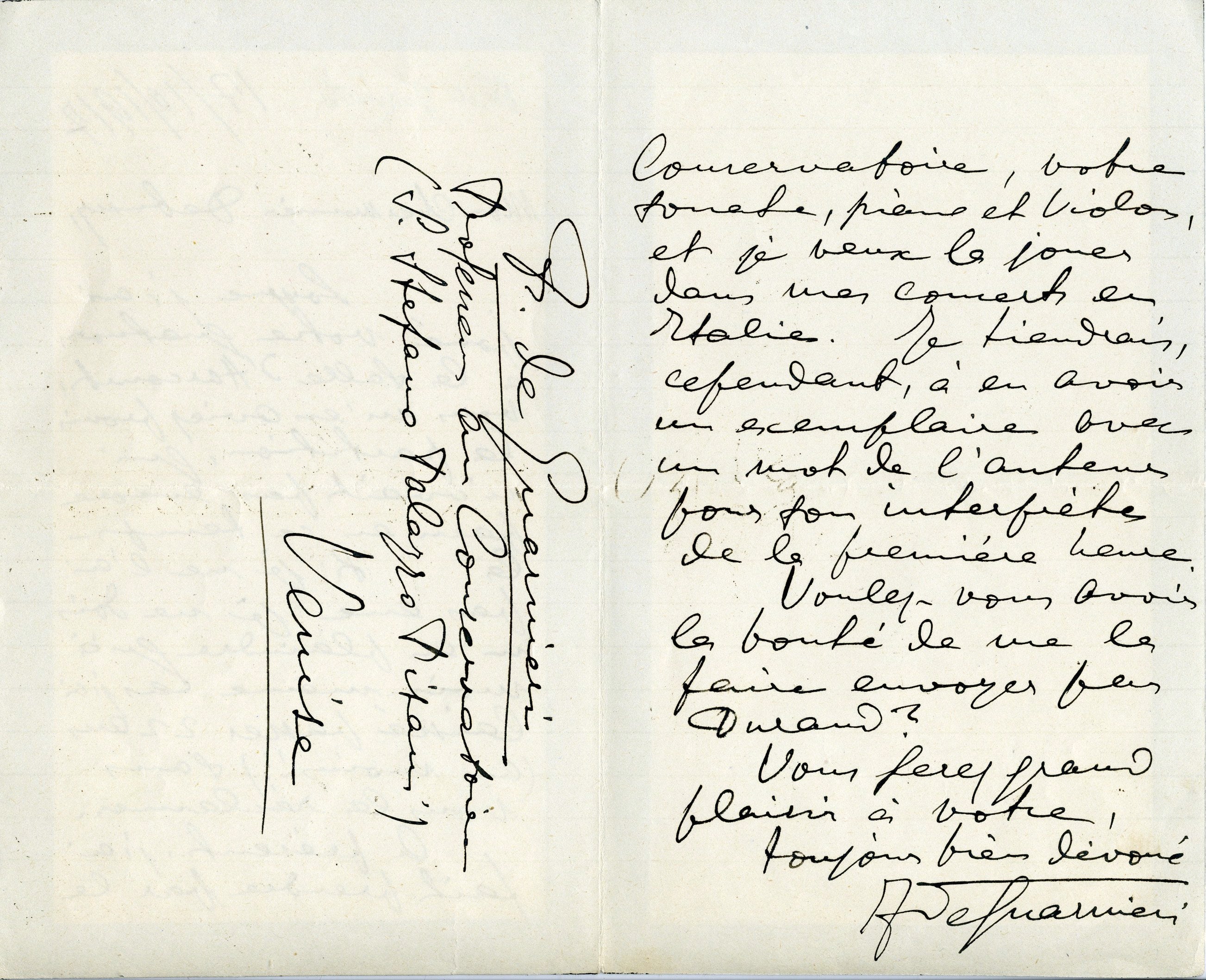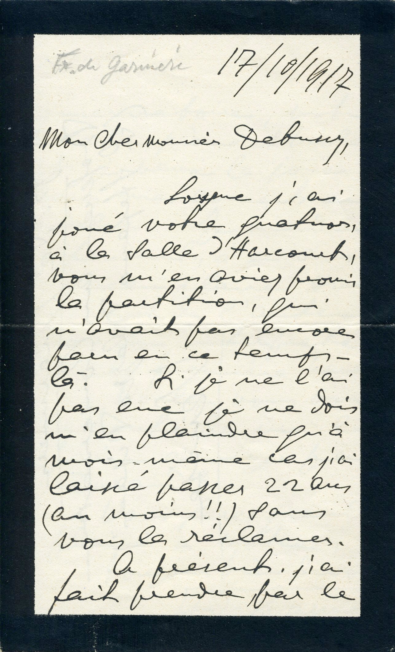 The violinist and composer Francesco Guarnieri writes (N.p., October 17, 1917, 2 pp., on black-bordered stationery) to ask Debussy for a signed copy of his violin sonata, which he will perform in Italy, and also recalls a much earlier performance of Debussy's famous quartet, at which Debussy gave him a copy of the score.