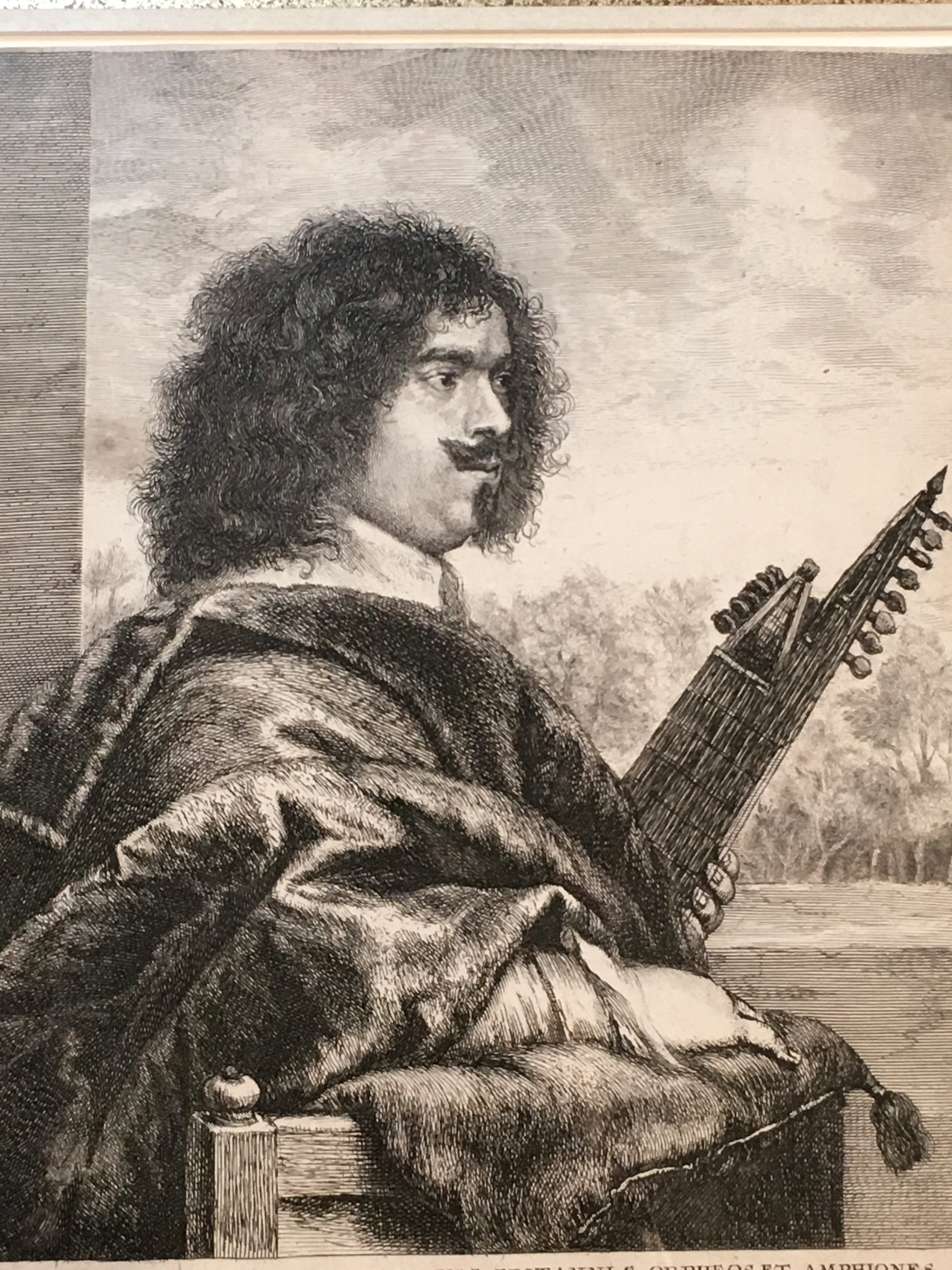 Gaultier was court lutenist in London from about 1617 to 1647. Lievens, after his roommate, Rembrandt, left Leyden to go to Amsterdam, fell under the influence of Van Dyck, and went to London for a time where he etched this now celebrated portrait.