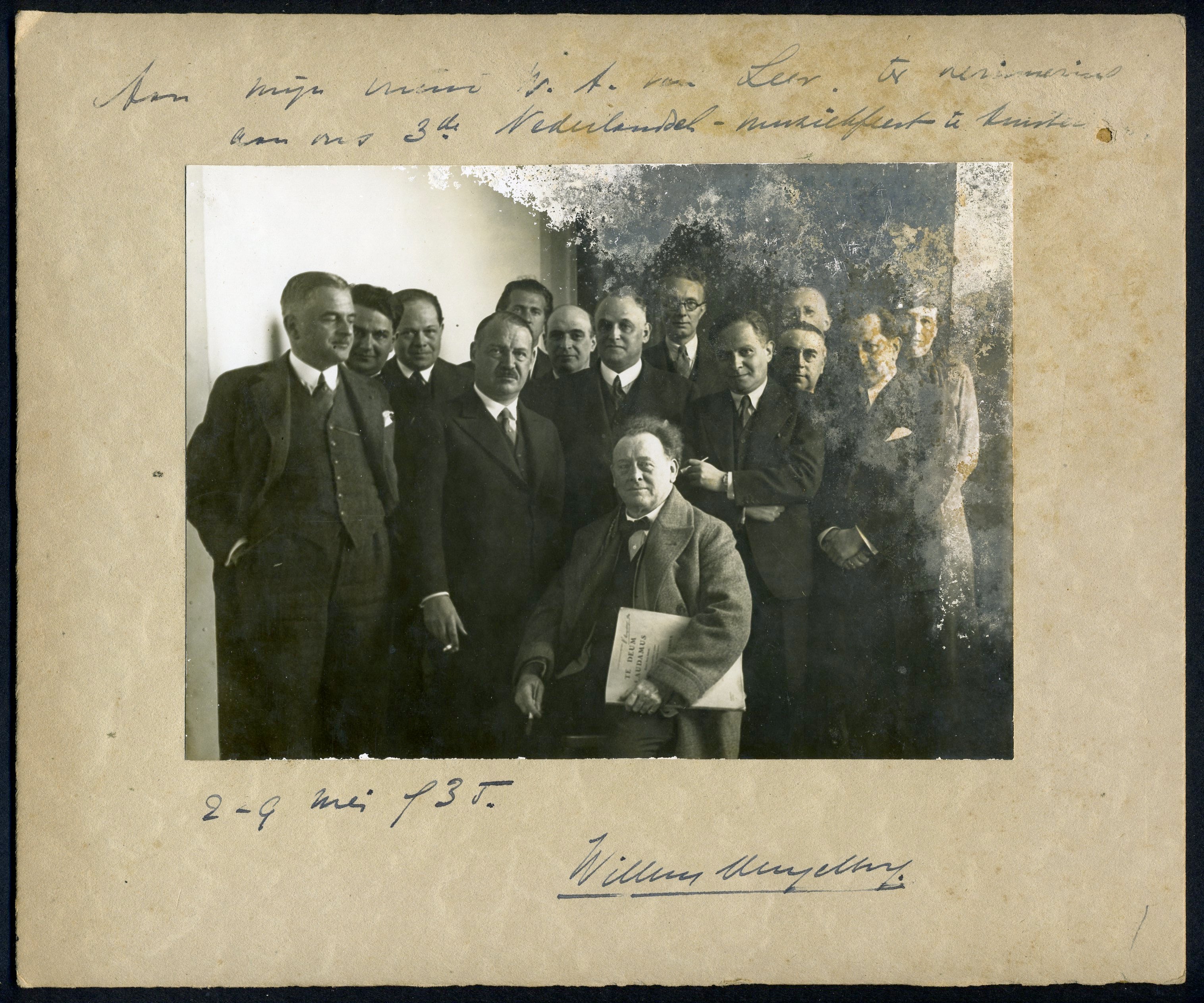 Signed photograph of the important conductor, friend and advocate of Mahler, Strauss, Schoenberg and Reger. Shown surrounded by a group of colleagues and holding the score to a Te Deum, Mengelberg has signed on the mount below the image and dated May 2-9, 1935. He has also penned a caption in Dutch above the image. Heavy water damage to a portion of the photograph and overall toning and foxing; otherwise in good condition. Photograph 7 x 5 inches (17.6 x 12.7 cm), mounted to 9.75 x 8.25 inches (25 x 21 cm).