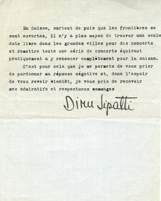 147. Lipatti, Dinu. (1917-1950) [Descaves, Lucette. (1906 - 1993)] Typed Letter Signed
