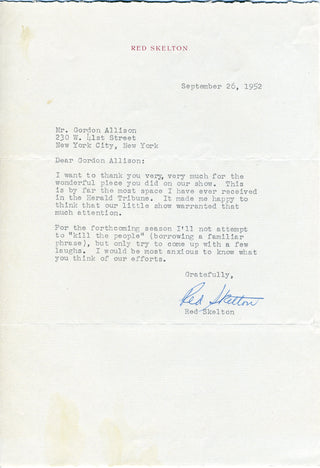 252. Skelton, Red. (1913 - 1997) Signed Letter to Gordon Allison.