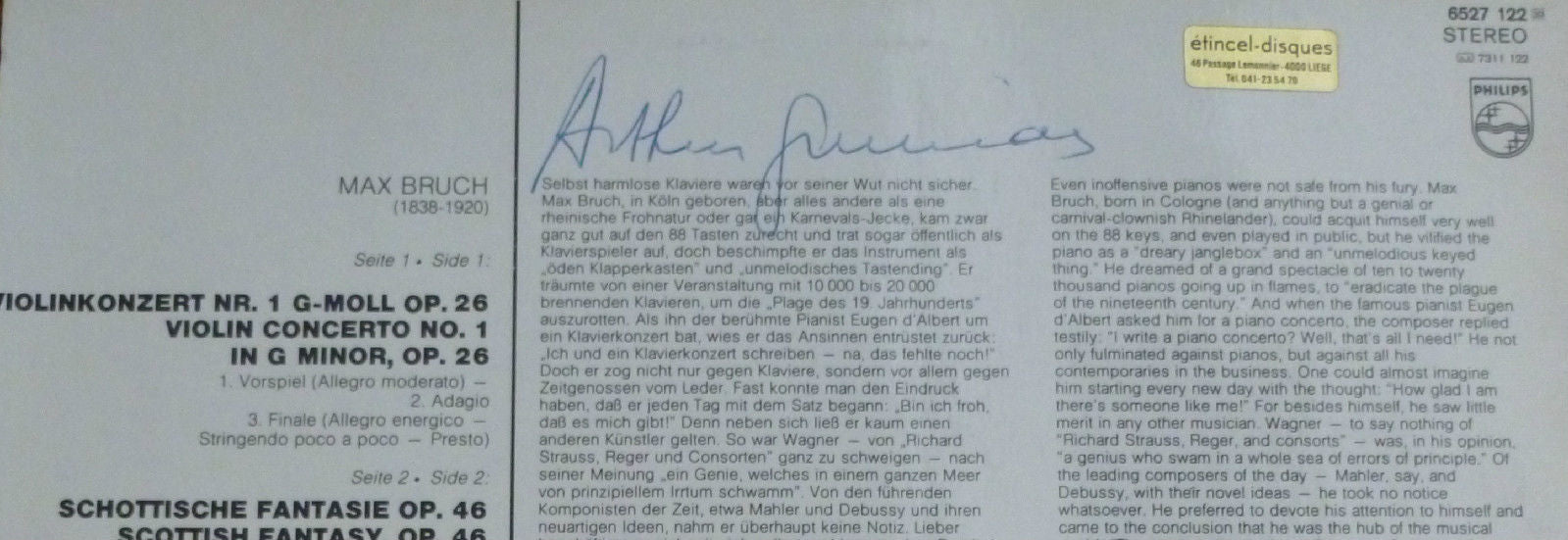 Uncommon signed LP recording from the masterful Belgian violinist, who here performs the Bruch Concerto for violin no 1 op.26 and Scottish Fantasy op.46 with the New Philharmonia Orchestra conducted by Heinz Wallenberg. HOLLAND PRESSING - red & white label PHILIPS - 6527 122. Signed in blue ink on the verso and in fine condition.