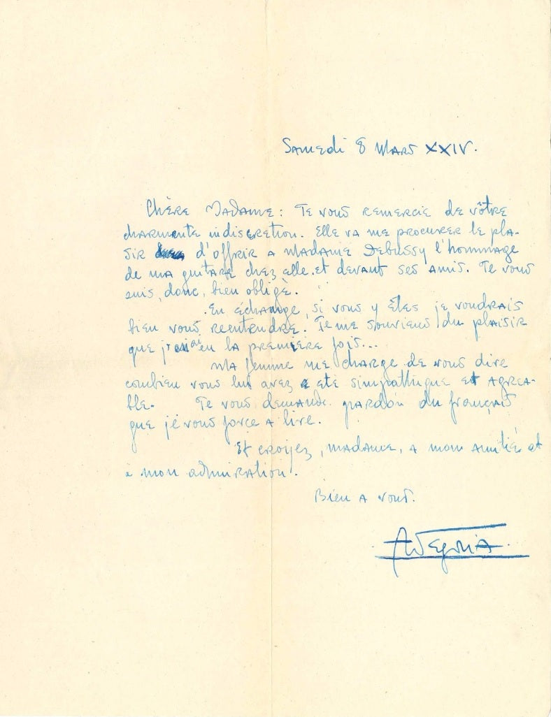 Autograph letter from the virtuoso Spanish classical guitarist to the singer Magdeleine Greslé, dated March 8, 1924, on the subject of a small recital to be given at the home of Emma Debussy. Translated from the French, in part: "Thank you for your charming indiscretion. It will provide for me the pleasure of offering my performance on the guitar at Madame Debussy's house for her and her friends. So I am very obliged to you. In exchange, if you are here, I would like to hear you again. I remember what a pleasure it was the last time." He continues: "My wife asks me to say how kind you were to her. Please excuse the French which I am forcing you to read." 1 p. with the original envelope. Folding creases and light toning; overall in fine condition. 8.25 x 10.5 inches (21 x 27 cm).  Uncommon from this period.