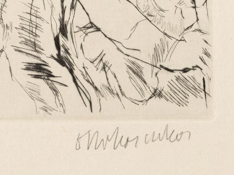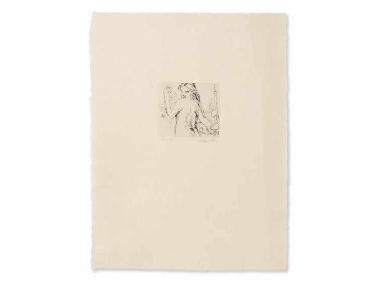 Original 1970 drypoint from the important Austrian Expressionist painter, sculptor, graphic artist and writer. Plate 1 from the portfolio "Penthesilea," which consists of illustrations for the famous tragedy of the same name by Heinrich von Kleist. Signed in pencil ("O.Kokoschka") at the foot and numbered (numbering in the images deviates from the real numbering of the lot). Catalogue raisonné: Wingler/Welz 454. Published by Ars Liborum, Edition de Beauclair, Frankfurt and printed by Hermann Steidle, Essen. Image size: 13 x 15 cm.