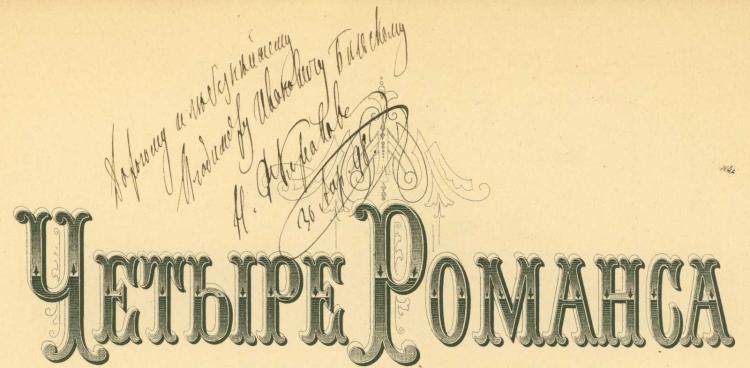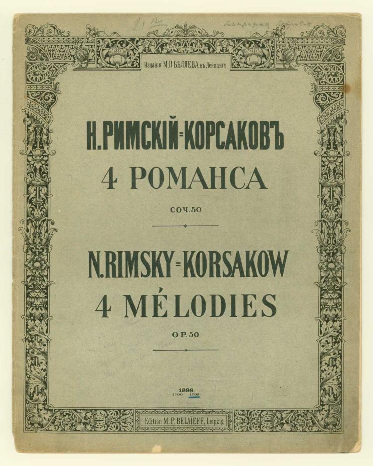 Rimsky-Korsakow, Nikolai. (1844–1908). 4 Romances, op. 50 - INSCRIBED TO LIBRETTIST VLADIMIR BELSKY. 1898: Leipzig. M. P. Belaieff. First edition for low voice..