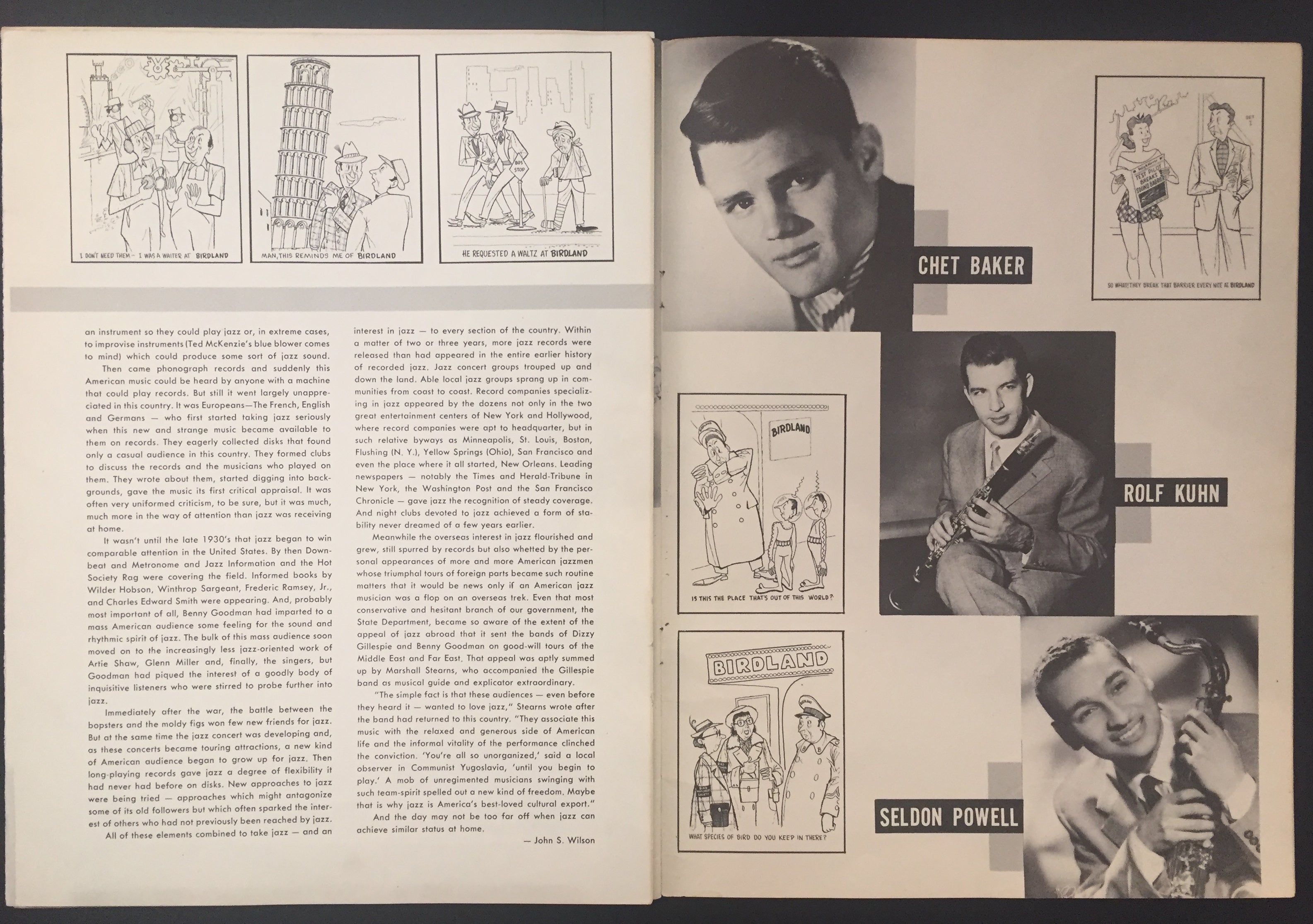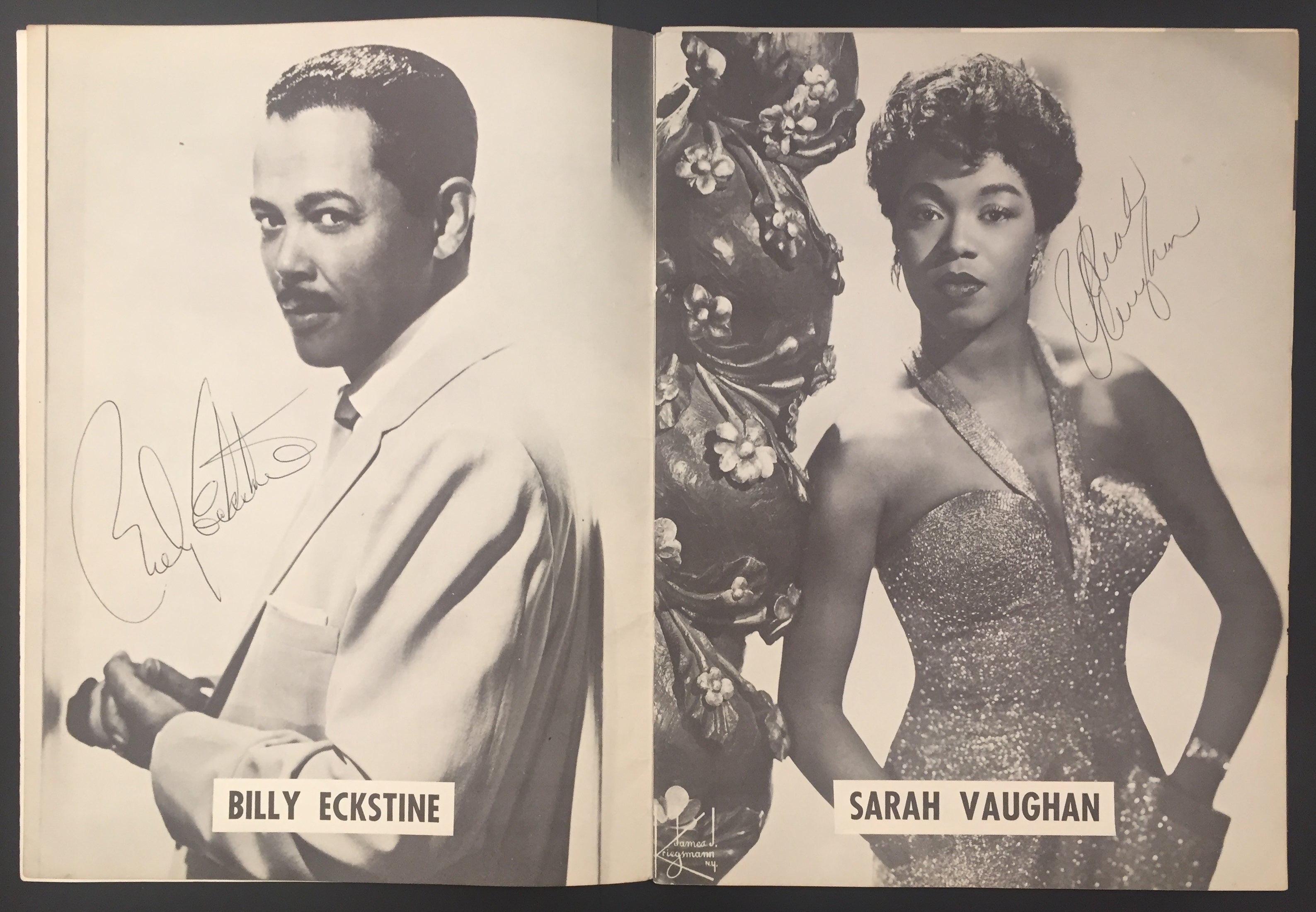 Original souvenir program from the 1957 jazz tour, signed over their photographs by vocalists Billy Eckstine, Sarah Vaughan, and Joe Williams, bandleader Count Basie, vibraphonist Terry Gibbs, pianist Phineas Newborn Jr., and drummer Sonny Payne, and also featuring photographs of Jeri Southern, a young Chet Baker, Bud Powell and others. 24 pp. Wear to the spine, with some pages detached from the staple binding; overall in very good condition. 9 x 12 inches (22.7 x 30.5 cm).