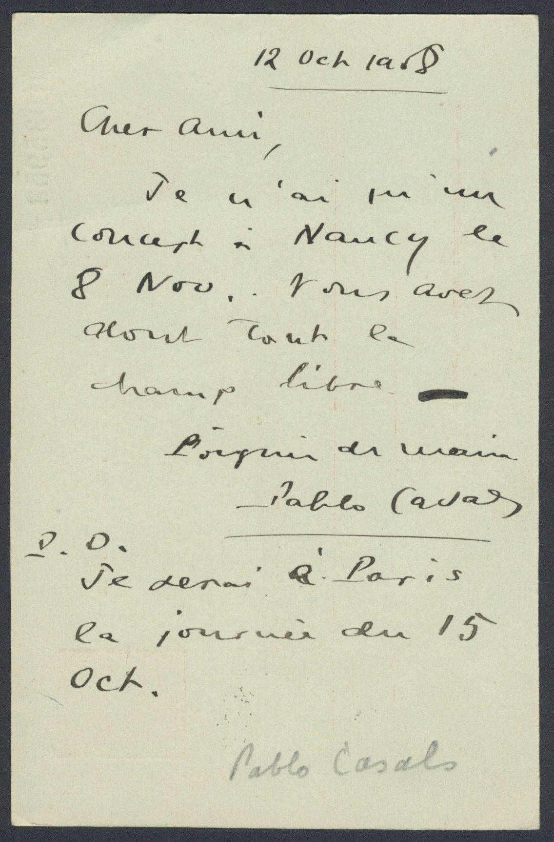 Casals, Pablo. (1876–1973). Autograph Postcard. Early autograph postcard from the great Catalan cellist to Paul Boquel, director of the Société des amis des Arts, regarding concert dates. Postmarked October 12, 1908. Casals writes (translated from the French): "Dear friend, I do not have a concert in Nancy on November 8. So you have the whole field free. [...] Pablo Casals. I will be in Paris during the day on October 15." In very fine condition. 3.5 x 5.5 inches (9.2 x 14.1 cm).