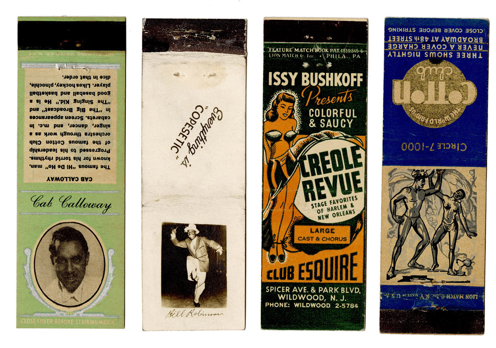 Group of four colorful 1930's night-club and jazz-related matchbook covers. Included are covers advertising Cab Calloway, with a portrait and a brief text about him; Bill "Bojangles" Robinson, with a facsimile of his signature and the line "Everything is Copesetic"; Issy Bushkoff's Creole Revue at the Club Esquire; and the Cotton Club, with a drawing of African dancers. Folding creases and staple marks with some light wear; overall very good. Each ca. 1.5 x 4.5 inches (4 x 11.5 cm). An evocative grouping of ephemera!