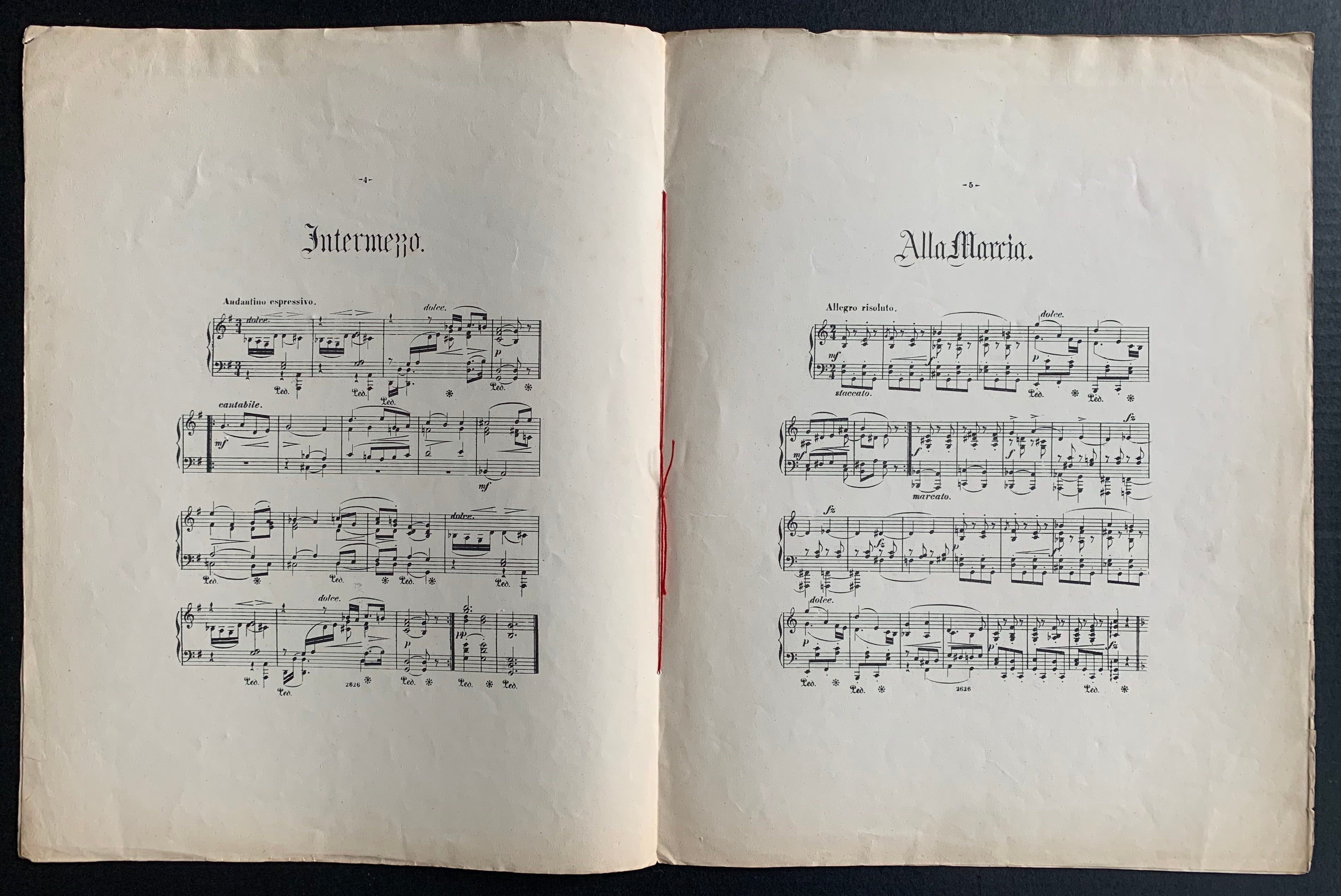Upright folio. Title, 2-7 pp. Lithographed. [PN] 2626. Bound with a single, bright-red thread. Composer's name playfully rendered on cover as the notes G, A, D, and E on a staff, a musical version of the titular puzzle in which words are typically represented by combinations of pictures and individual letters. Includes three piano pieces: Scherzo, B-flat major; Intermezzo, G major; Alla marcia, C major. Inscription in an unknown hand upper right of title, heavy foxing to front cover, light foxing throughout, else fine. 10.75 x 13.75 (27.3 x 34.9 cm.). Uncommon.