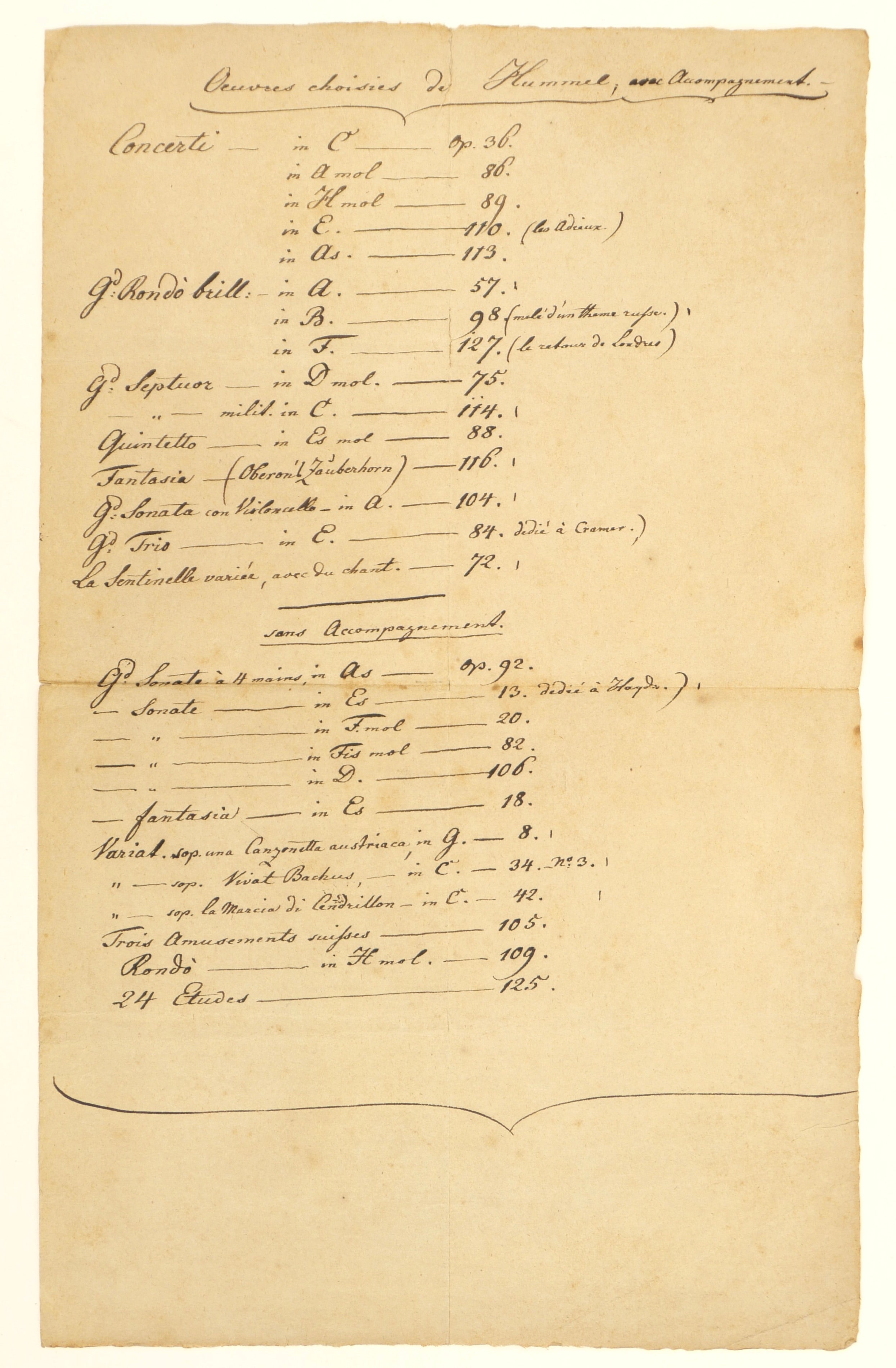 Autograph list in French of "Selected works of Hummel," entirely in the hand of the influential pianist and composer, who signs his name within the heading. A list of 27 works in two categories: with and without accompaniment (i.e. for piano with or without other instruments/voices). No date, probably ca. 1832, with the highest listed opus being 127, his last completed work, composed in 1831. 13.5 x 8.5 inches (34 x 21 cm).
