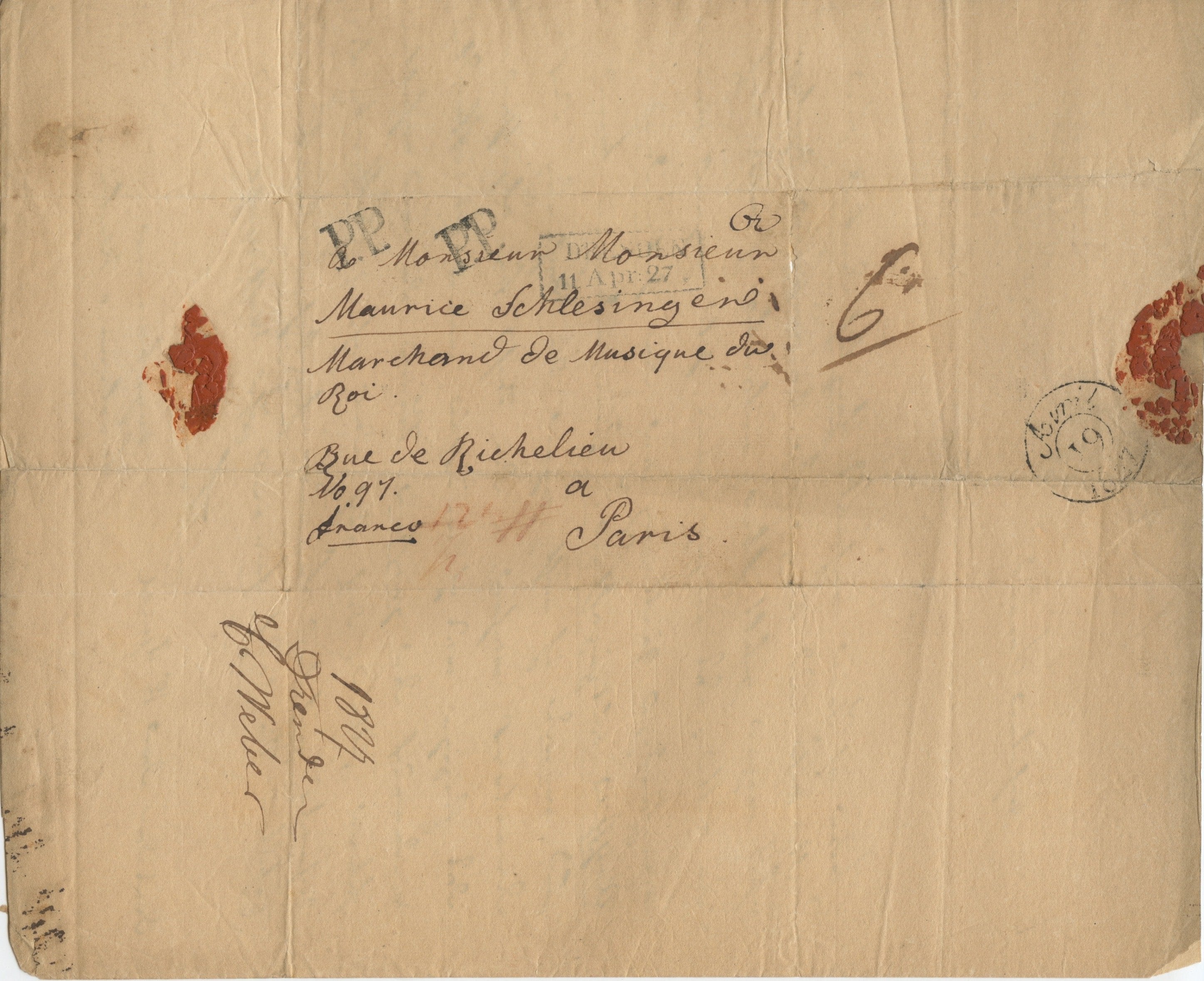 ALS of the German singer and actress, wife of composer Carl Maria von Weber (1786-1826), to the German-born, Paris-based publisher. In German. Dresden, April 12, 1827 (postmark reads "April 11"). 1 p., with address to verso. "Dear Friend! Sending you my heartfelt thanks once more for all the hassle and concerns that you have has because of our transaction, I take license to come up with another request: to pay the money received to the Rothschild brothers in exchange for a receipt signed by myself. I cannot and will not make any objections to the director's invoice..." Probably a reference to claims brought up after the early death of Carl Maria von Weber in the previous year. Maurice Schlesinger (1798-1871) lived in Paris from 1821, operating his own business from the beginning. The bank of the Rothschild Brothers (there were five) was represented in Paris by the youngest, James de (originally Jakob Meyer) Rothschild (1792-1868).