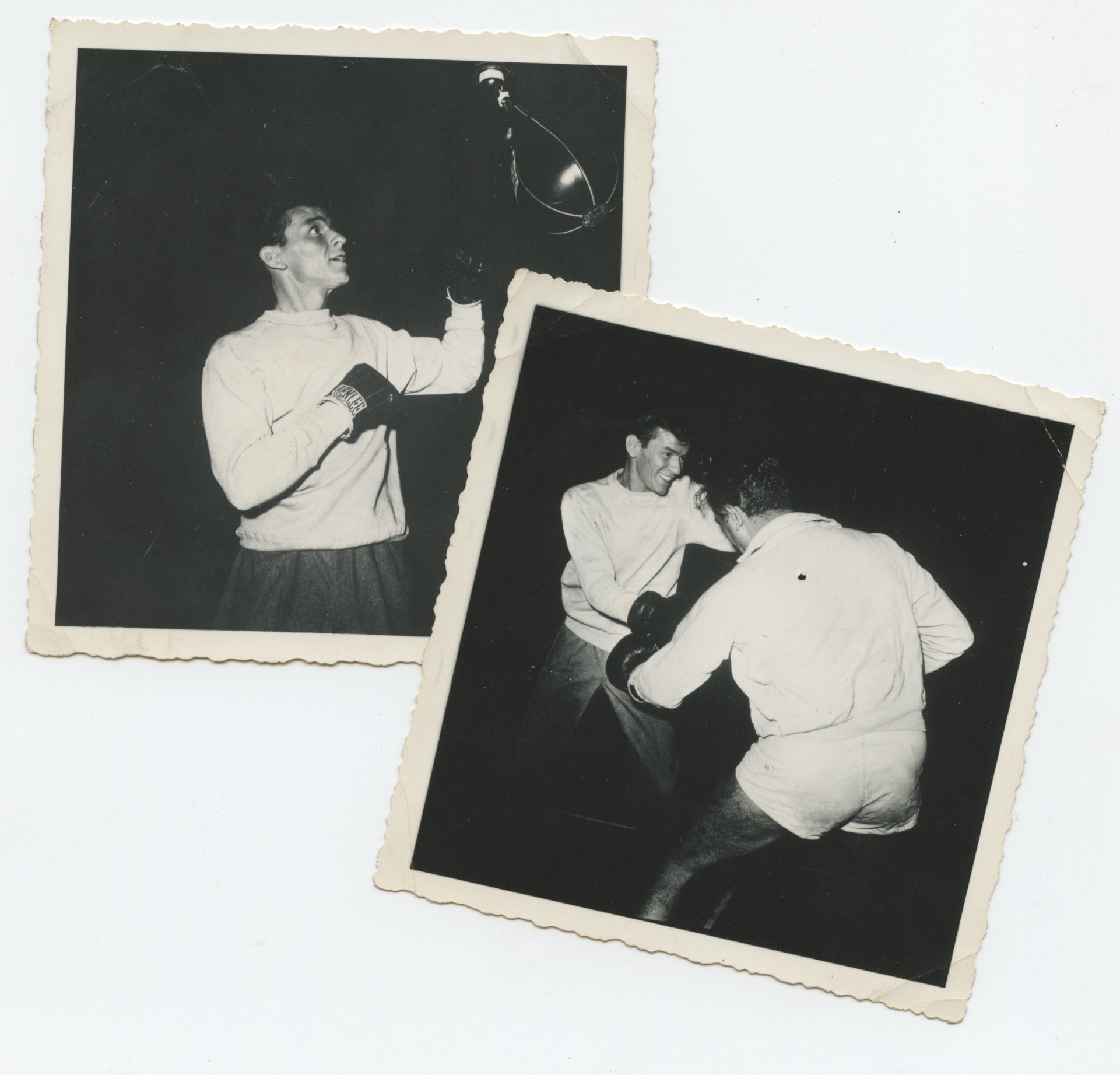 Remarkable pair of vintage original candid 3.5 x 3.5 inches (8.9 x 8.9 cm) glossy photographs of a very young Sinatra boxing with a suspended punching bag and sparring with an unidentified companion. Ca. early 1940s and almost certainly unpublished, each stamped 339 to the verso. Creases to corners, else fine.
