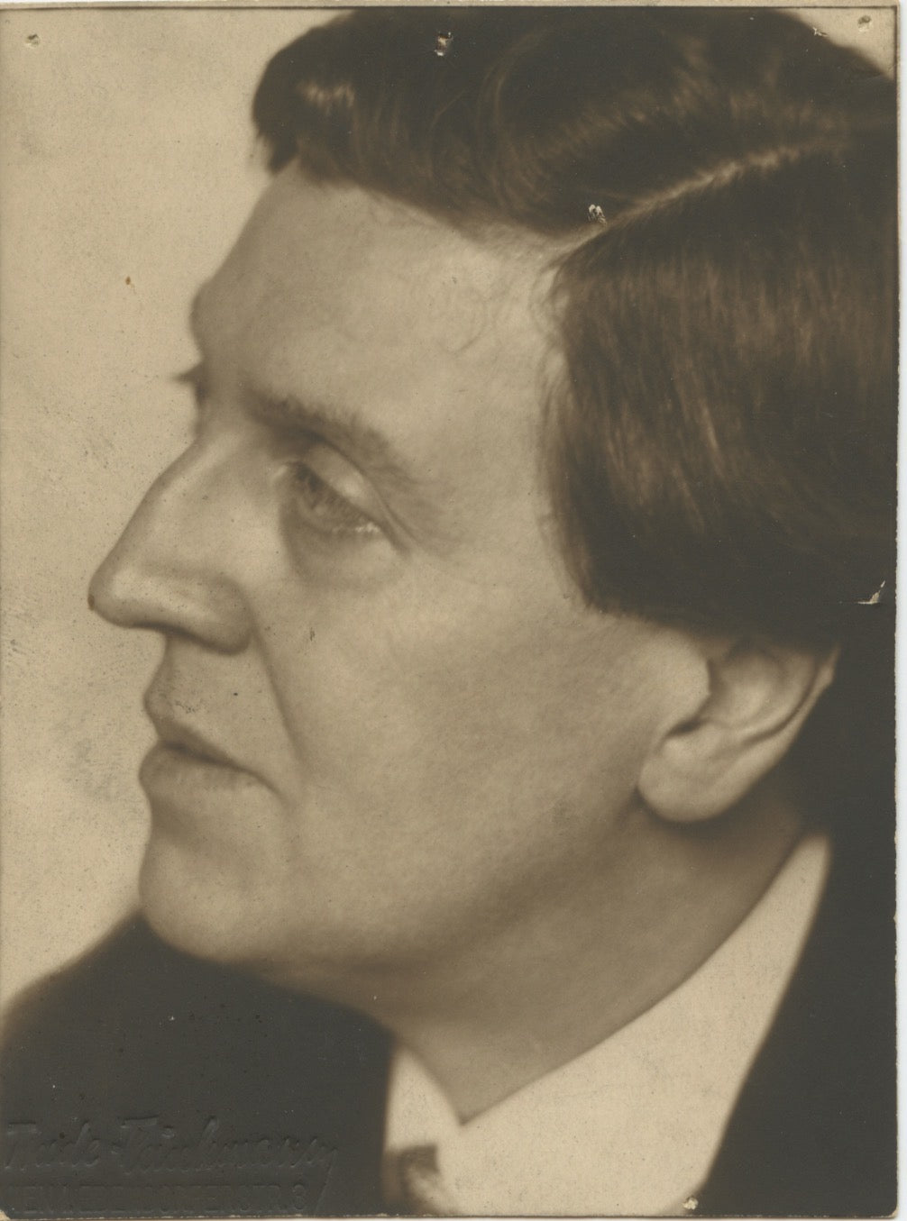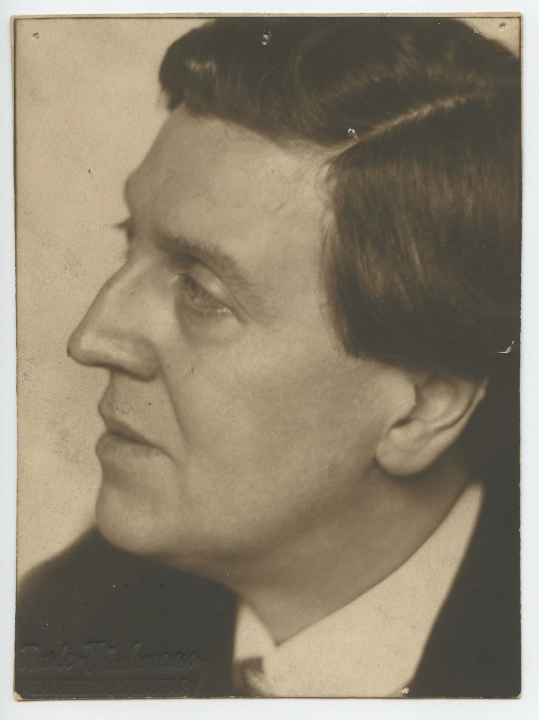 Vintage bromoil silver gelatin photograph of the great composer, shown in a profile portrait from the collar up. Stamped pencil by the photographer, Trude Fleischmann of Vienna, lower left. Scattered small stains and abrasions, two small pinholes to upper corners, notation in pencil on the verso, else fine. 3.6 x 4.5 inches (8.4 x 11.4 cm).