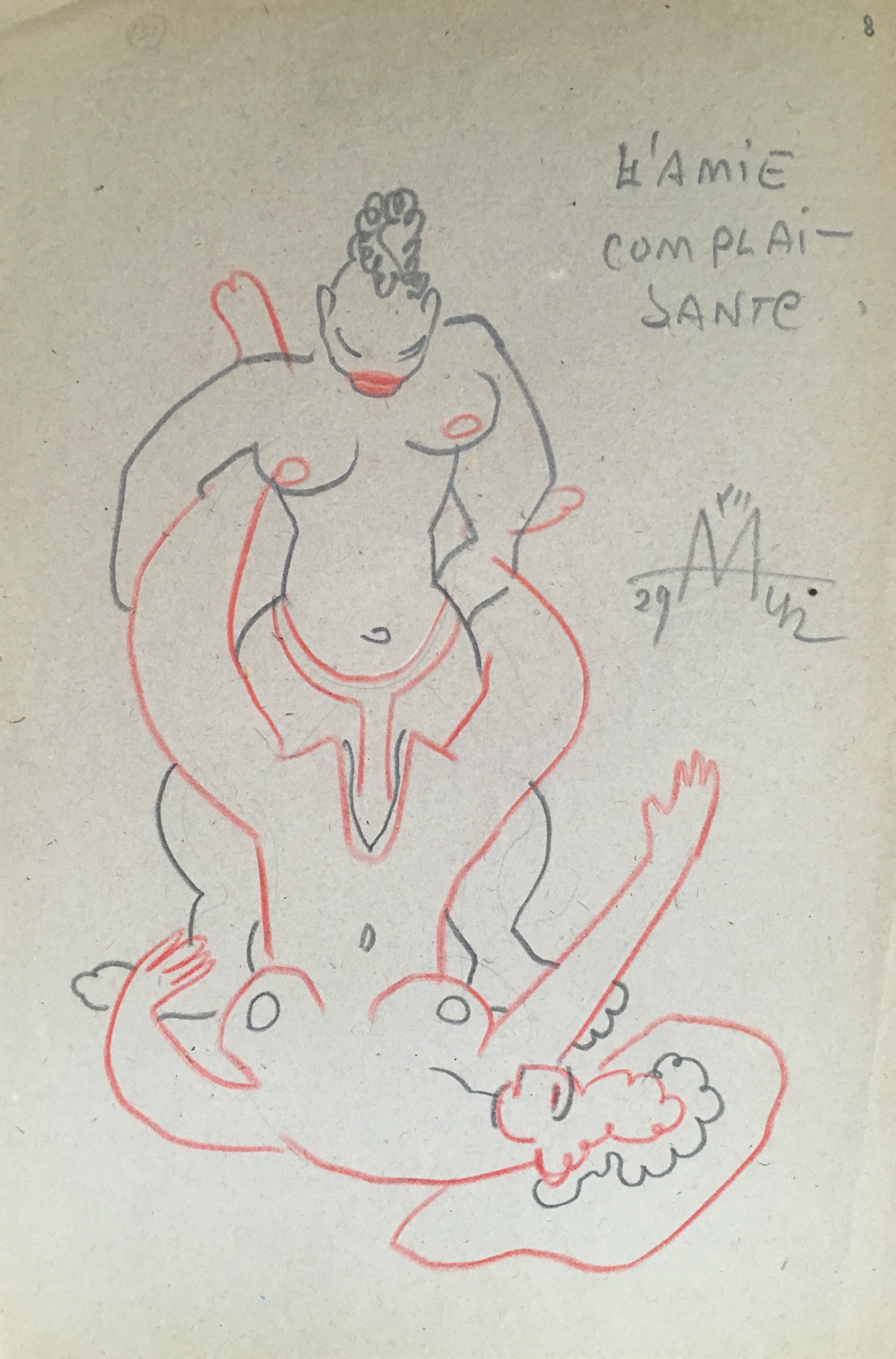 [Dance & Film] Eisenstein, Sergei. (1898–1948). "L'AMIE COMPLAISANTE" - Erotic Drawing. Original drawing on paper in red and black pencil and crayon, titled "L'AMIE COMPLAISANTE" ["The Accommodating Friend"] and signed by the artist and dated 29.12.42. 330 x 220 mm. Previously from the collection of Jean-Claude Marcadé and Galia Ackerman, authors of the reference book on Eisenstein's erotic drawings "Dessins Secrets" (Le Seuil, 1999), in which the present work is illustrated as plate 100.