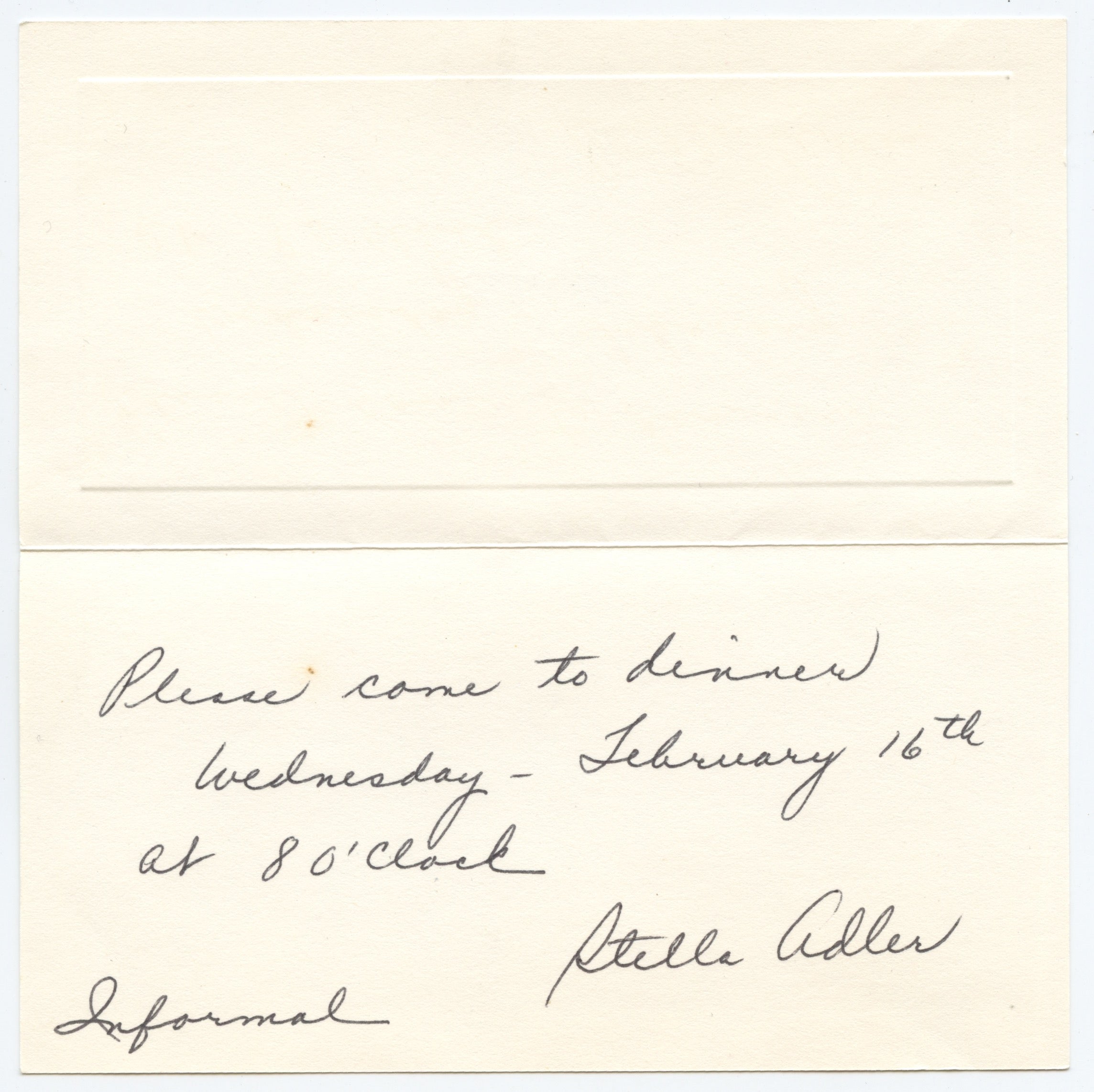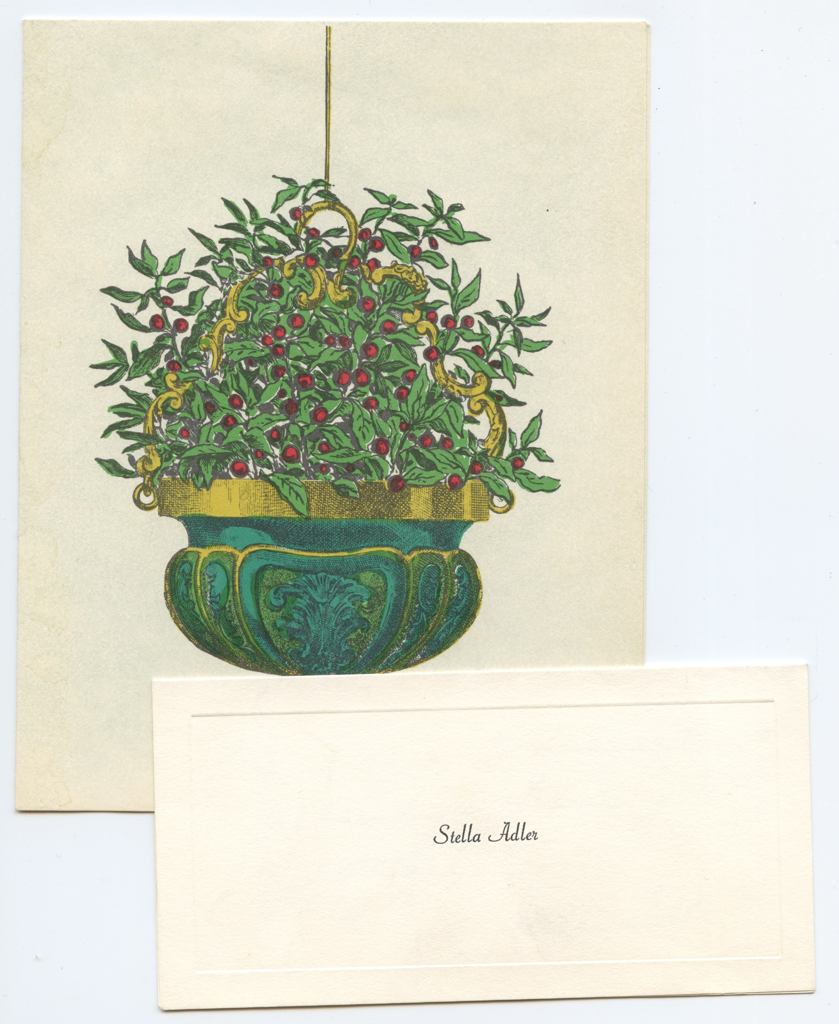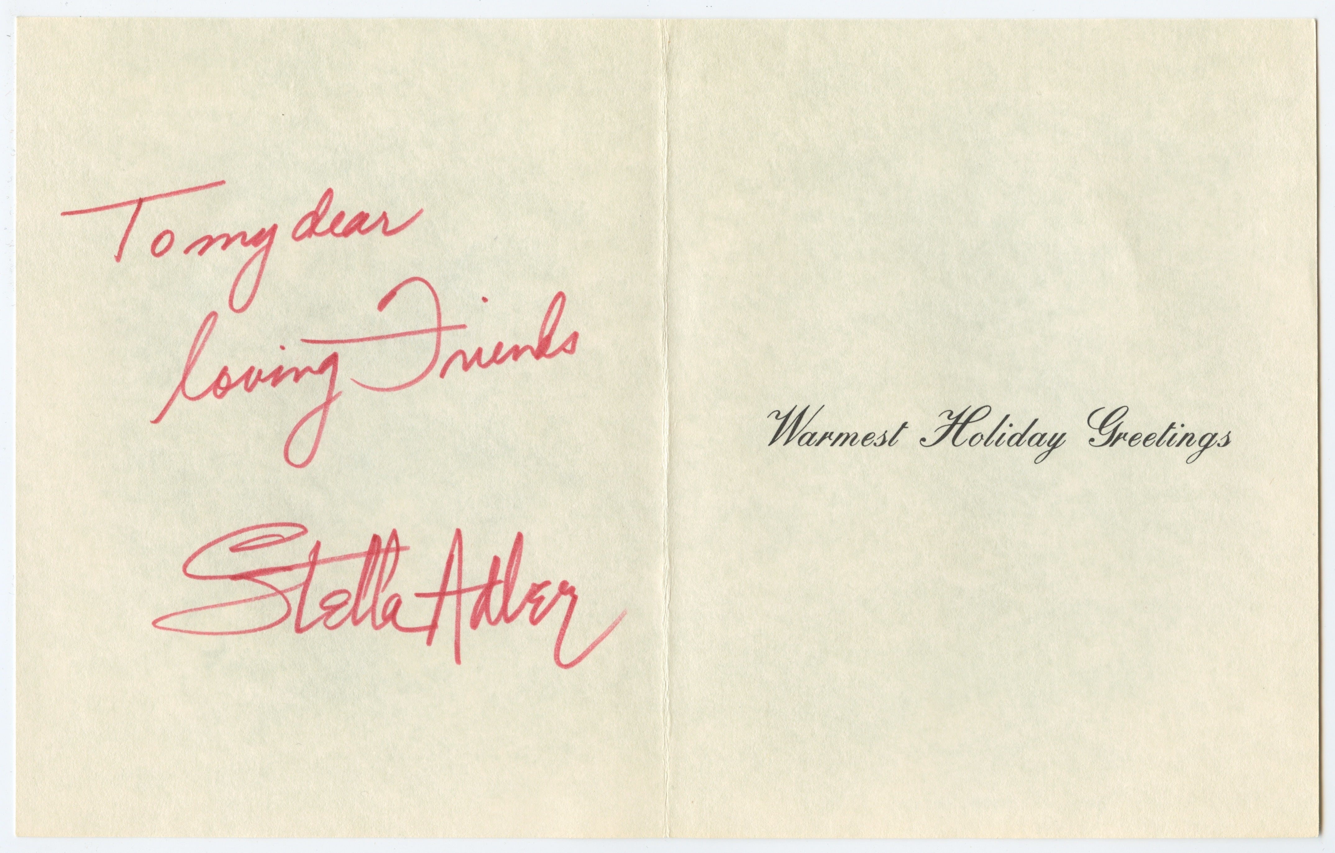 Adler, Stella. (1901–1992). Signed Holiday Card and Dinner Invitation. Signed holiday card from the American actress and acting teacher, who has penned inside a card printed with an illustration of holly: "To my dear friends / Stella Adler." Together with an autograph dinner invitation penned on a card printed with her name: "Please come to dinner Wednesday - February 16th at 8 o'clok. Stella Adler. Informal." Fine. 5.25 x 6.5 inches (13.3 x 16.8 cm) and 5.5 x 2.75 inches (14 x 7 cm).