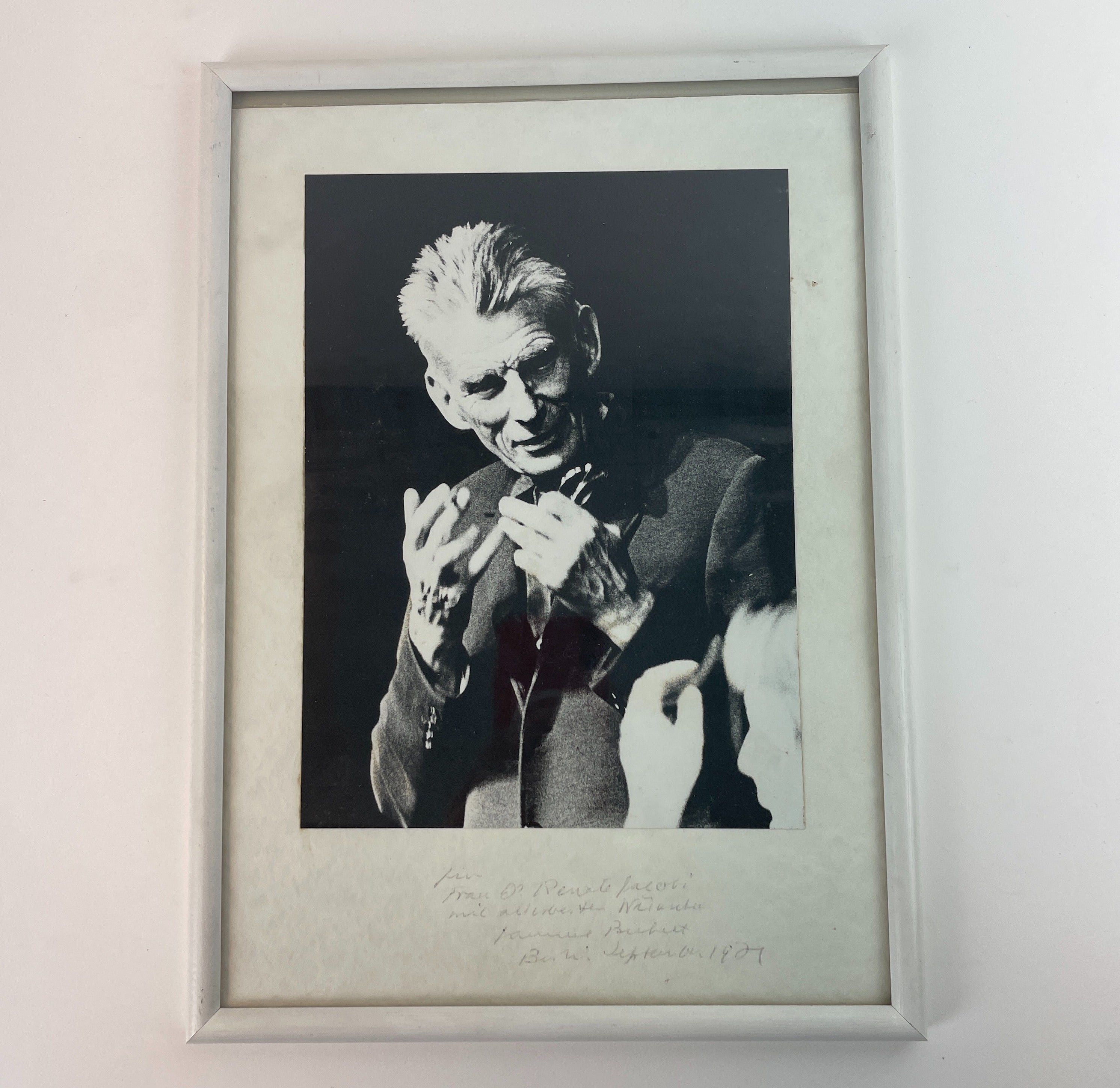 Original photograph of the important Irish novelist and playwright, who has signed and inscribed in black ink to the lower mount, "Für Dr. Renate Jacobi / mit allerbesten Wünschen, Berlin September 1971". The photographer is unidentified. Dedication a shade light, overall in fine condition. 8.25 x 11.75 inches [21 x 29 cm] and set in a simple white wooden frame.