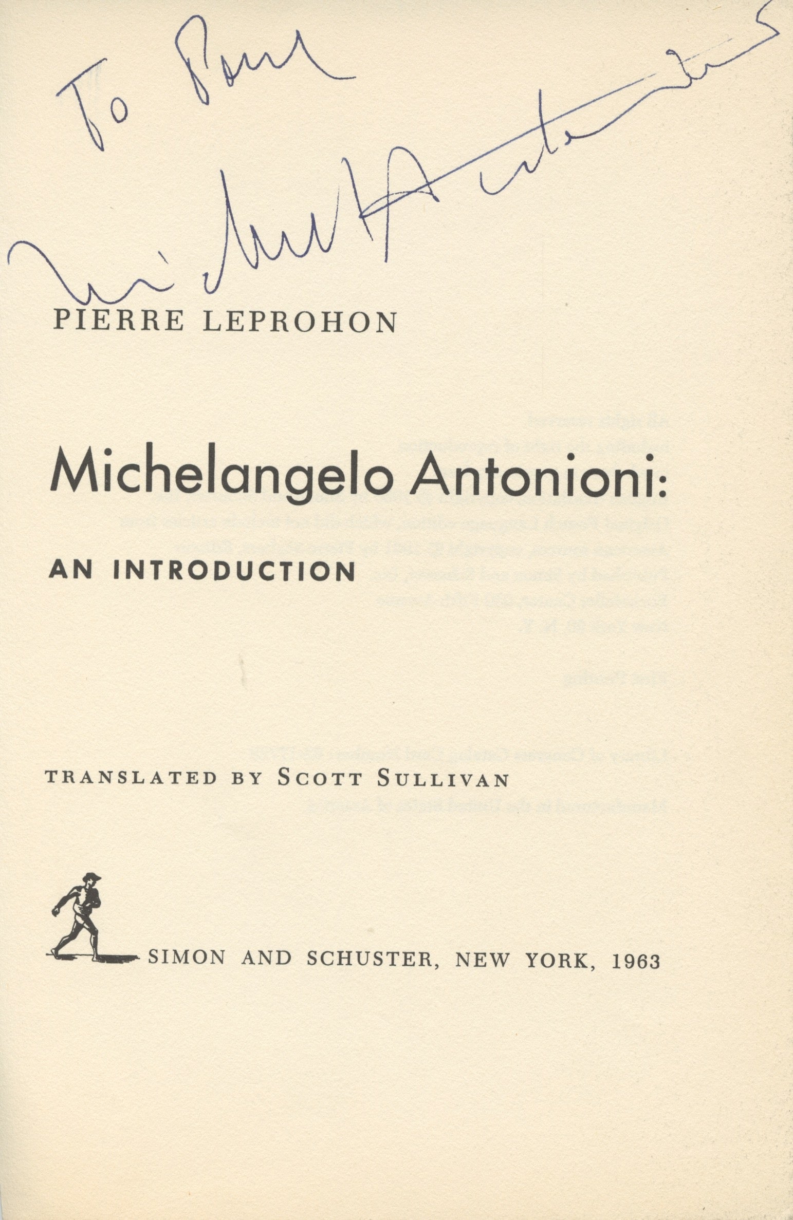 Signed title page of the English translation of Pierre Leprohon's book Michelangelo Antonioni: An Introduction (New York: Simon and Schuster, 1963), on the celebrated Italian filmmaker. Cut from the book and signed and inscribed to Paul McMahon by Antonioni. 8 x 5.25 inches (20.3 x 13.3 cm). In fine condition.