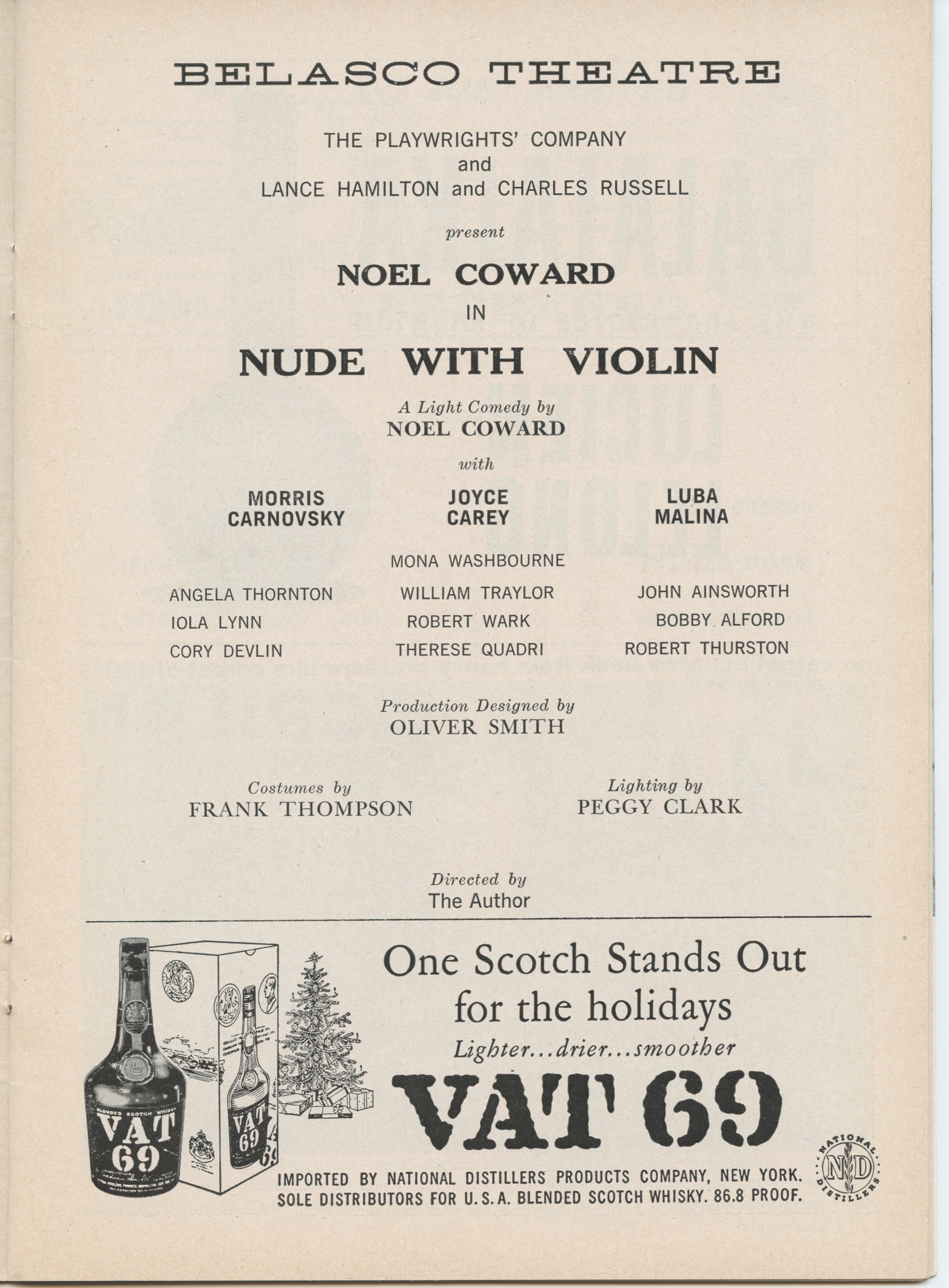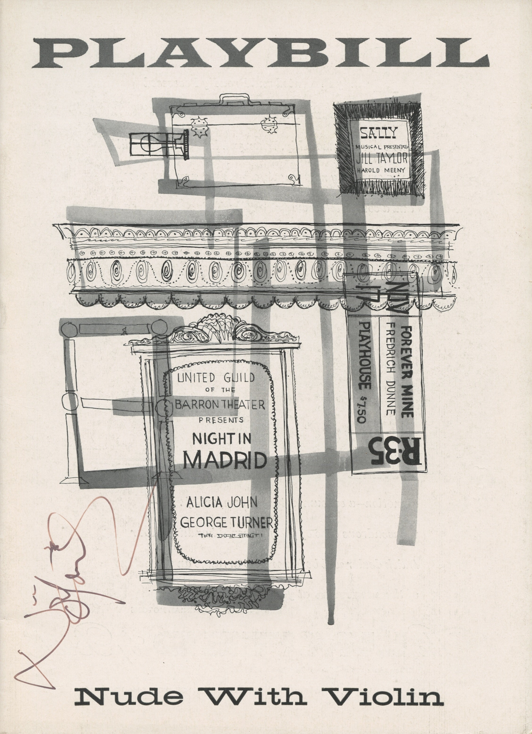 Coward, Noël. (1899-1973). "Nude With Violin" - Signed Program. Signed program from the English playwright and wit, who starred in his own comedy Nude With Violin at the Belasco Theatre in December 1957. He has signed on the cover of the playbill. 48 pp. Very fine. 6.5 x 9 inches (16.5 x 22.8 cm).