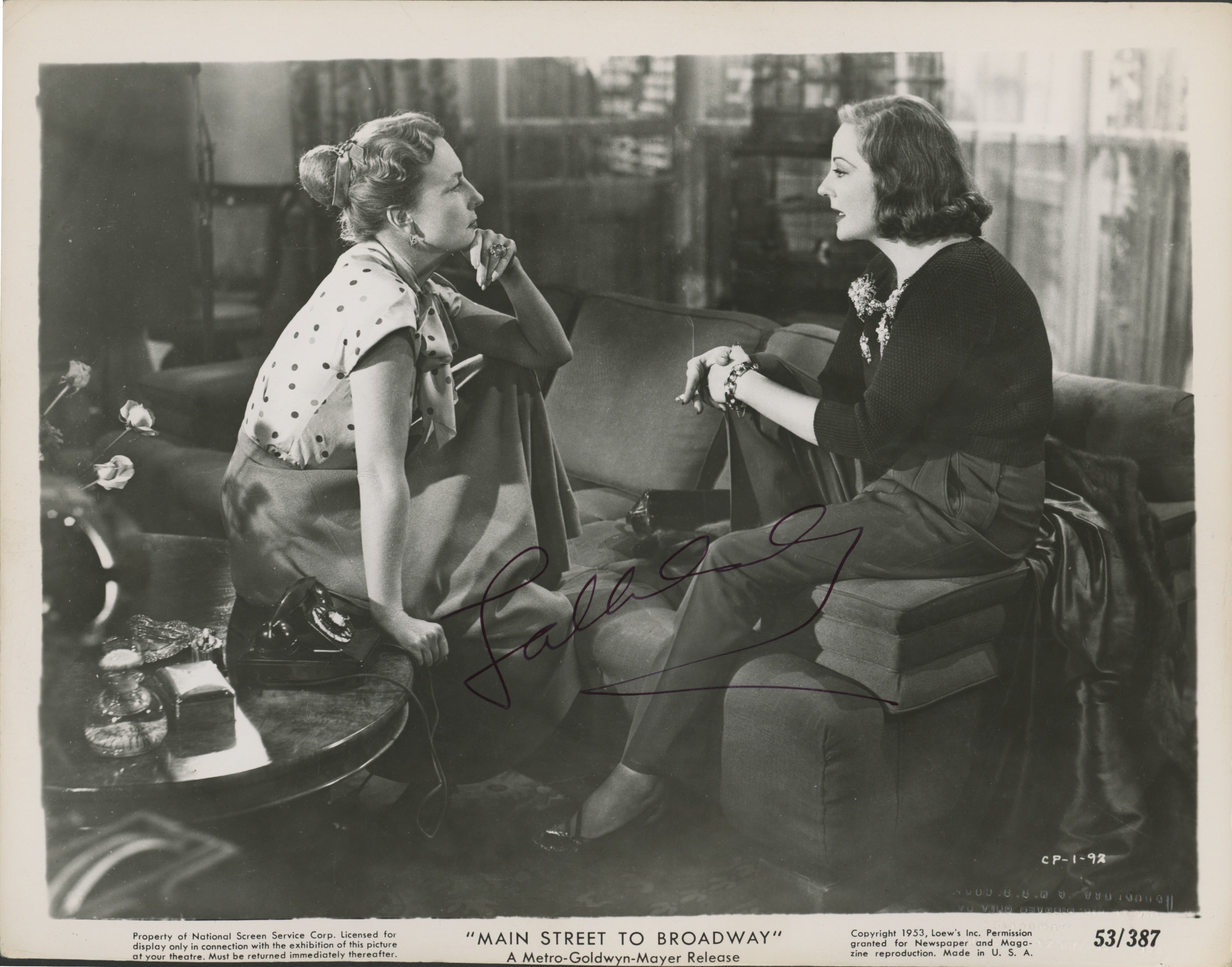 Signed promotional photograph of the American actress with costar Agnes Moorhehead in the 1953 MGM comedy Main Street to Broadway, a film that featured contemporary Broadway stars such as Bankhead playing exaggerated versions of their public personas. Embossed National Screen Service stamp to lower right corner, stamp reading "11 May 27 53" to verso. In fine condition. 10 x 8 inches (25.4 x 20.3 cm.).