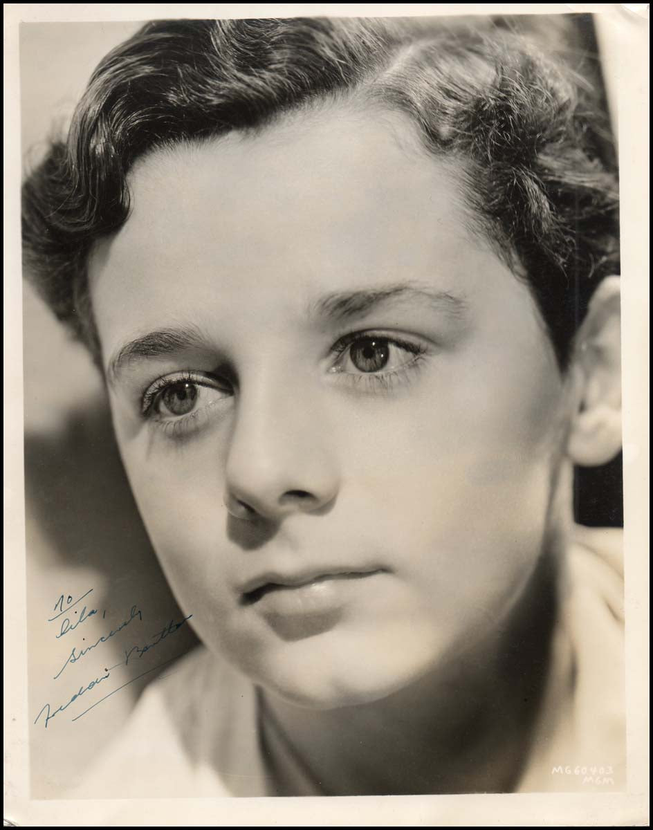 Vintage signed 8 x 10 inch photograph of the young British-born actor who was was offered the title role in David Copperfield by MGM. This film made him an overnight star and he went on to appear in such classics as Anna Karenina, Little Lord Fauntleroy, and Captains Courageous. After a tour of duty with the Air Force in World War II, his film career faded. He later remarked that the millions he had earned as a child had been spent largely on lawsuits, including the widely covered 1937 custody trial between his parents and his aunt. Fine.