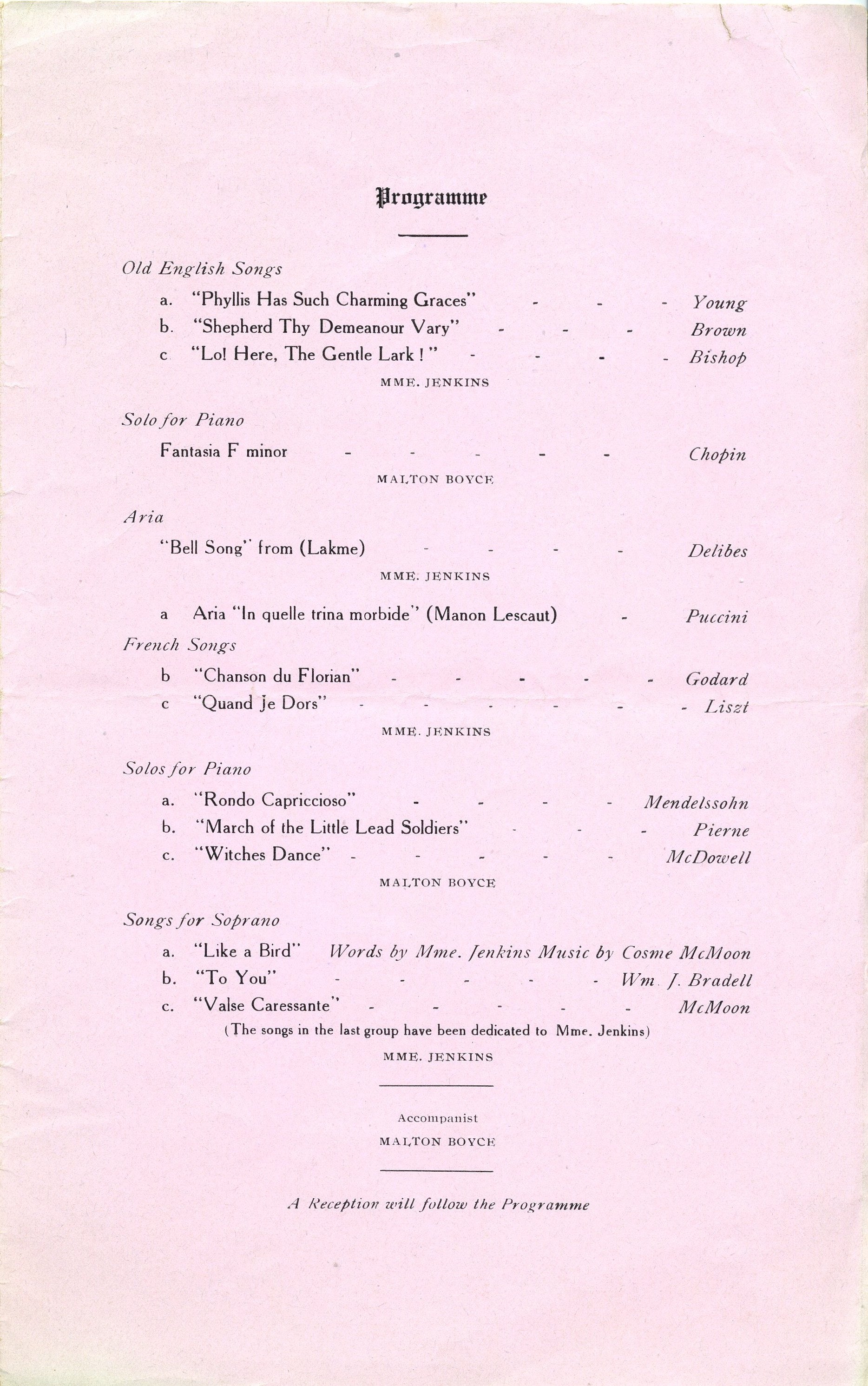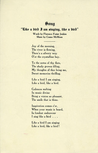 A very rare original program from one of the notoriously awful soprano's private song recitals, held in the last year of her life, on April 20th, 1944, at the Washington Club in Washington, D. C. Accompanied by Malton Boyce, the program included "Old English Songs," the "Bell Song" from Lakmé, and "Like a Bird," a song with music by her usual accompanist Cosme McMoon and words by Jenkins herself -- which are printed on a separate insert. The cover features a halftone photograph of a younger Jenkins in profile against a fabric screen, raising one of her arms in a rather odd gesture. 3 pp. Folding creases, some small tears and wear to the edges, but overall in very good condition. 6.25 x 10 inches (16 x 25.4 cm).