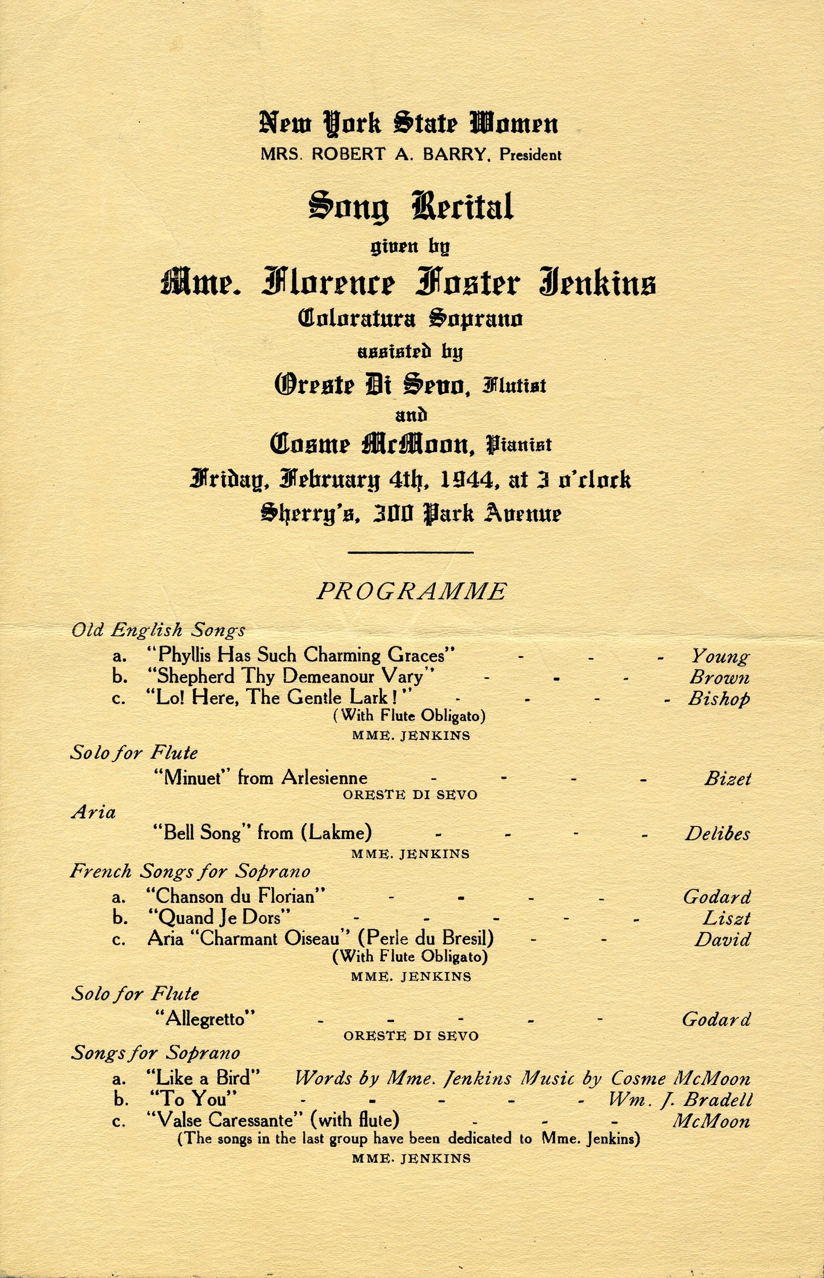 A very rare original single sheet program from one of the notoriously awful soprano's private song recitals, given by the New York State Women association on February 4, 1944. The program included "Old English Songs," the "Bell Song" from Lakmé, and "Like a Bird," a song with music by her accompanist Cosme McMoon and words by Jenkins herself. 1 p. One horizontal crease; otherwise in fine condition. 5.5 x 8.5 inches (14 x 21.5 cm).