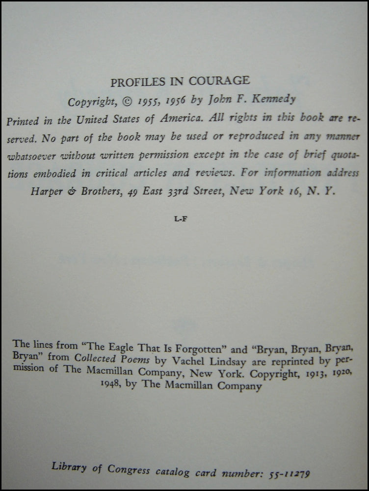 Kennedy, John F. (1917–1963). Profiles in Courage, SIGNED . New York: Harper & Brothers. 1956. Hardcover, in dust jacket. 266 pp. Light blue cloth with black spine and gold letters. Dust jacket carries original retail price of $3.50, is lightly worn at extremeties, but overall very good. Copyright page with the letters "L-F," indicating publication in November of 1956. In fine condition throughout. Signed and inscribed in ballpoint pen on the first free endpage by the 35th President of the United States, "To Helen Real - with very best wishes, John Kennedy."