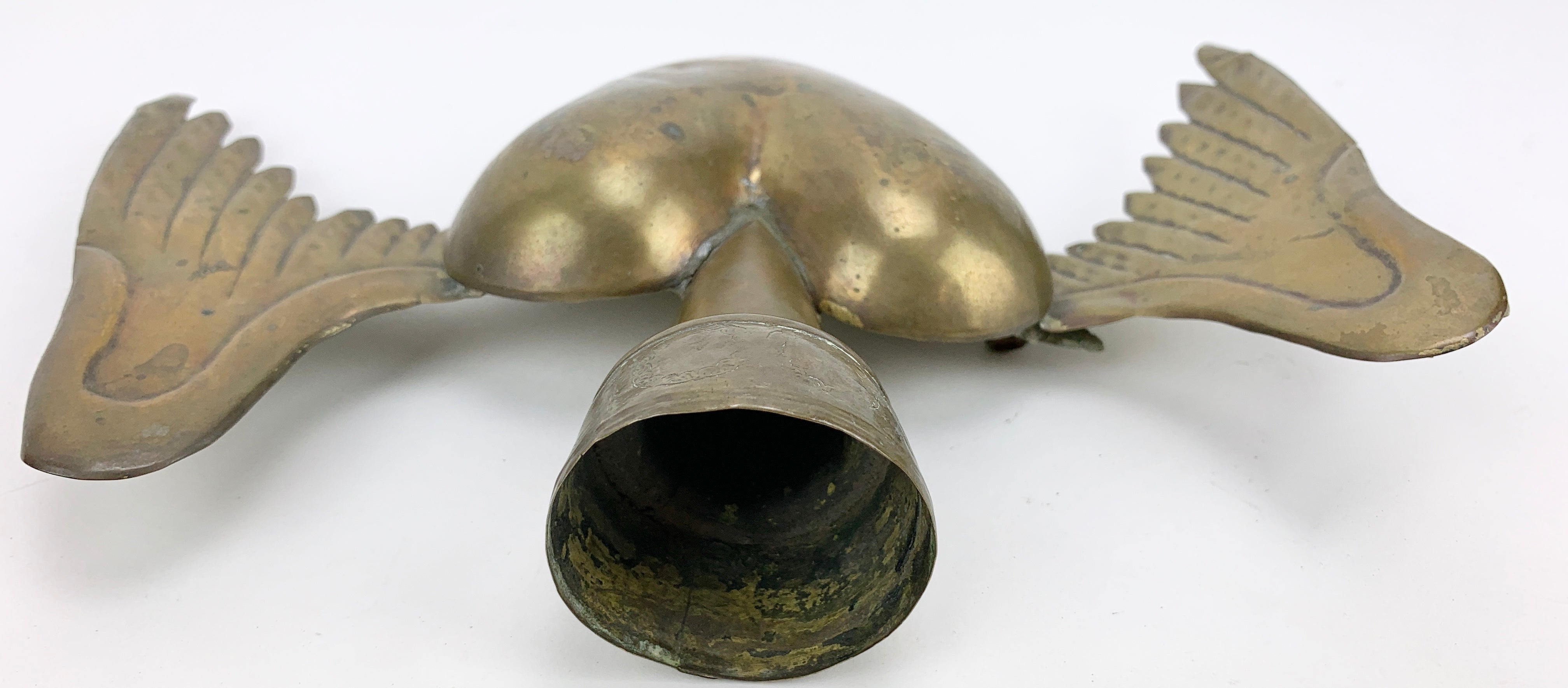 Gilded tin French candle holder, cast in the shape of a winged sacred heart. Ca. late 1800s - early 1900s. Mild aging present, with a layer of golden paint coating the verso. Overall in fine condition. Height 6.7 inches (17 cm.), width 10 inches (25.4 cm.).