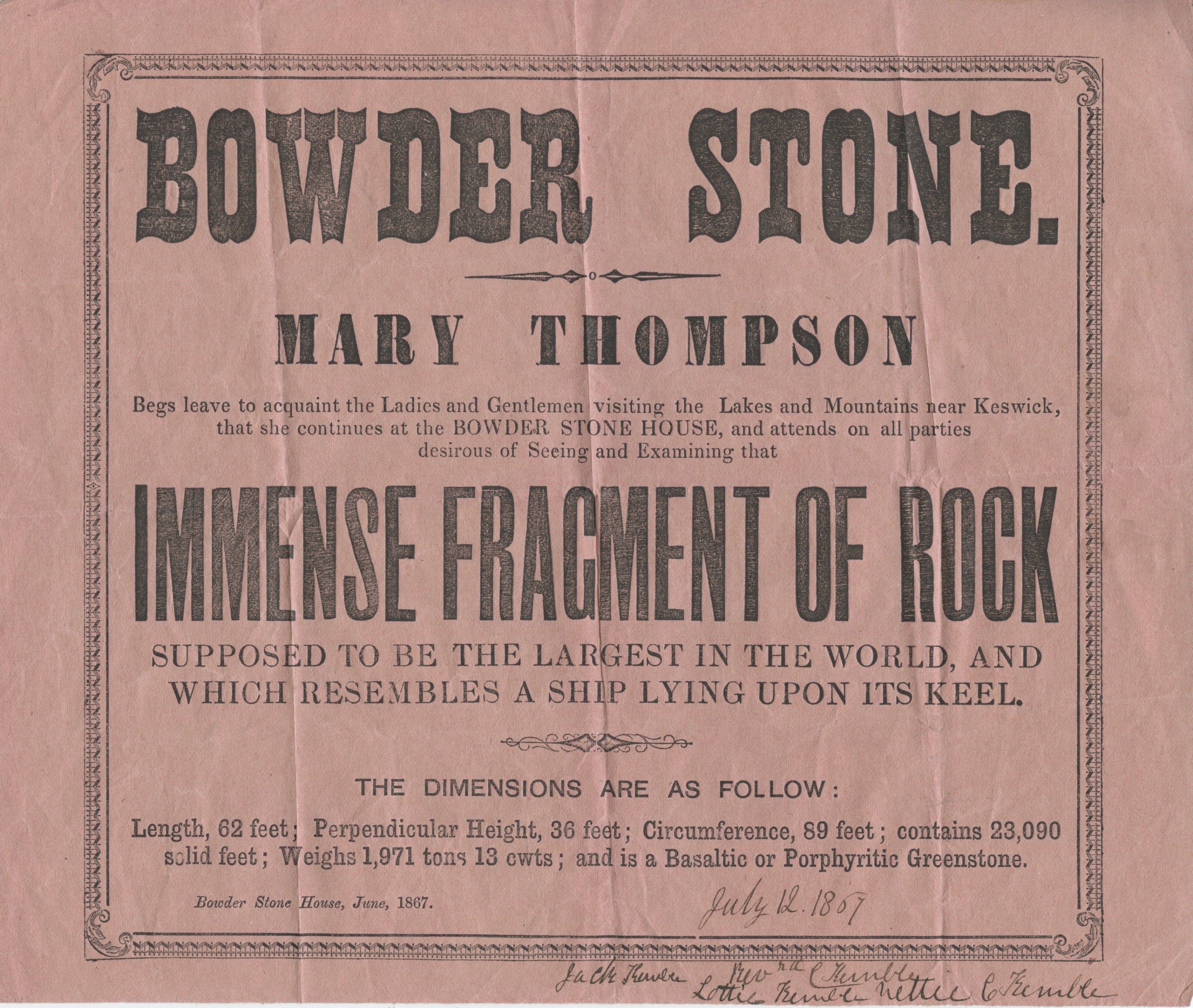 Printed flyer on dark pink paper advertising tours of the large andesite lava boulder in Borrowdale, Cumbria, England. "MARY THOMPSON Begs leave to acquaint the Ladies and Gentlemen visiting...that she continues at the BOWDER STONE HOUSE, and attends on all parties desirous of Seeing and Examining that IMMENSE FRAGMENT OF ROCK SUPPOSED TO BE THE LARGEST IN THE WORLD, AND WHICH RESEMBLES A SHIP LYING UPON ITS KEEL. The Dimensions Are As Follows: Length, 62 feet; Perpendicular Height, 36 feet; Circumference, 89 feet; contains 23,090 solid feet; Weighs 1,971 tons 13 cwts; and is a Basaltic or Porphyritic Greenstone." With handwritten date of July 12, 1867 to the foot and signatures of a visiting party composed of one Jack Kemble, Reverend C. Kemble, Lottie Kemble and Nettie C. Kemble. 9 x 7.5 inches; 23 x 19 cm. Folds, else fine. A most wonderful and strange bit of Victorian ephemera.