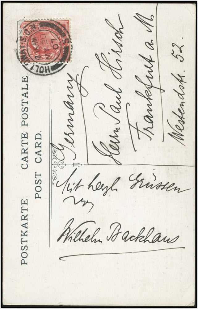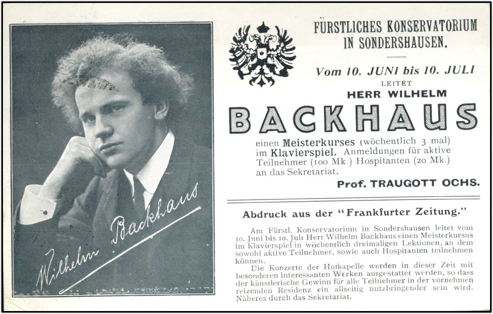 A short note and bold autograph from the great German pianist, on the verso of a postcard showing the young pianist and advertising a 1907 summer masterclass course.