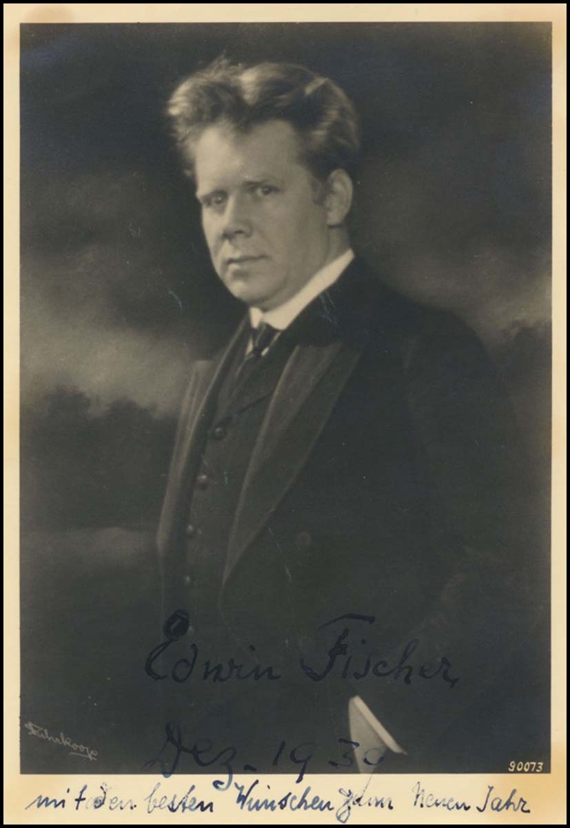 Fischer, Edwin. (1886-1960). Signed Photograph sending New Year's Greetings. Signed photograph of the great Swiss pianist, the first to record Bach's Well-Tempered Klavier. Signed "Edwin Fischer / Dez. 1939 / mit den besten Wunschen zum Neuer Jahr."