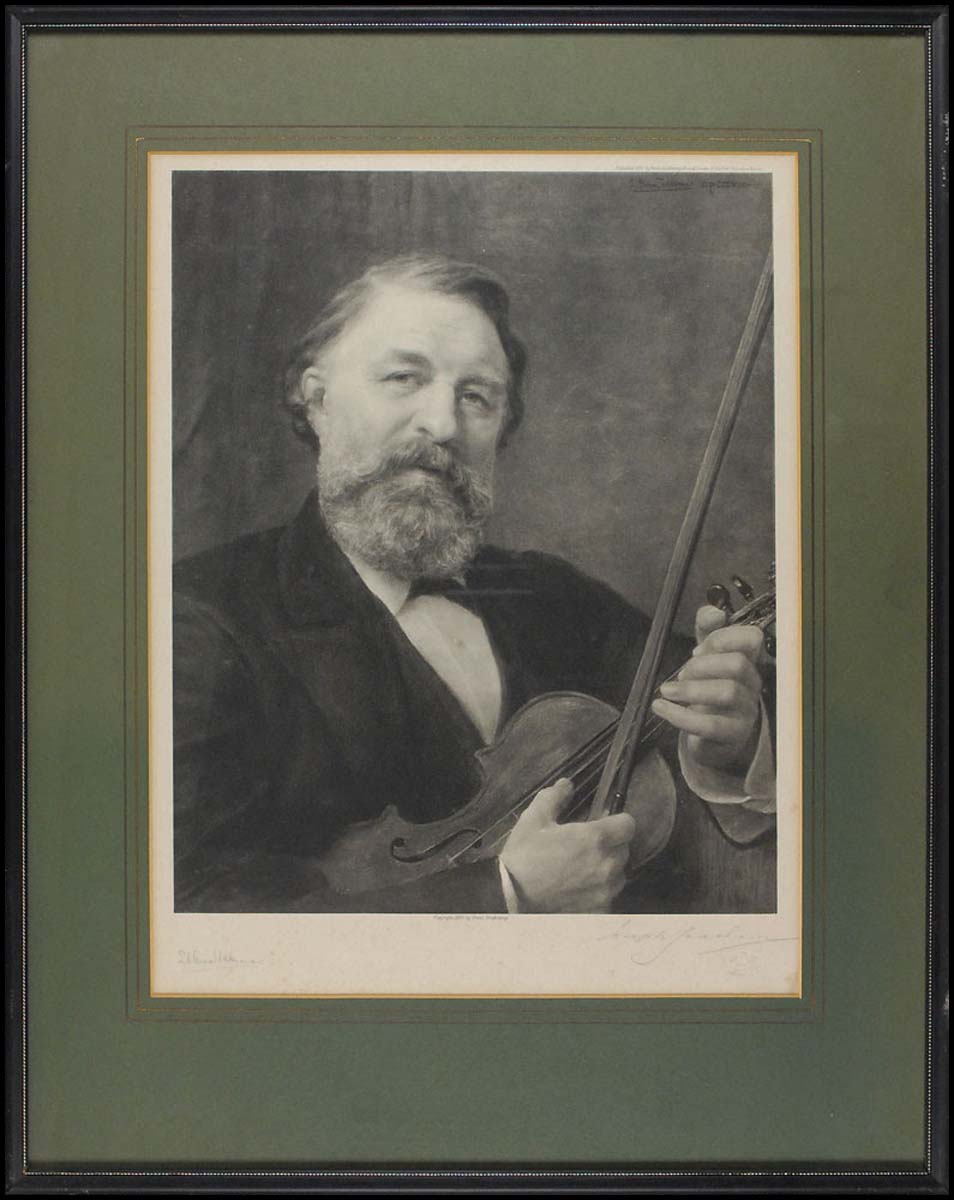 Joachim, Joseph. (1831-1907) & Alma-Tadema, Lawrence. (1836–1912). Signed Lithograph Portrait. Large original 1894 lithograph portrait of the seated violinist holding his violin and bow. 12.5 x 16.5, signed in the lower border in pencil and additionally signed by the artist Lawrence Alma-Tadema. Matted and framed to an overall size of 18.5 x 23.25. In fine condition, with a bit of scattered light foxing.