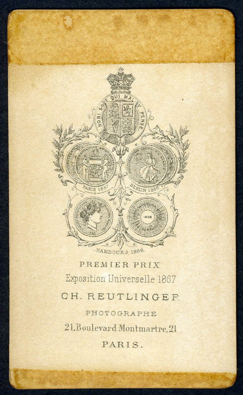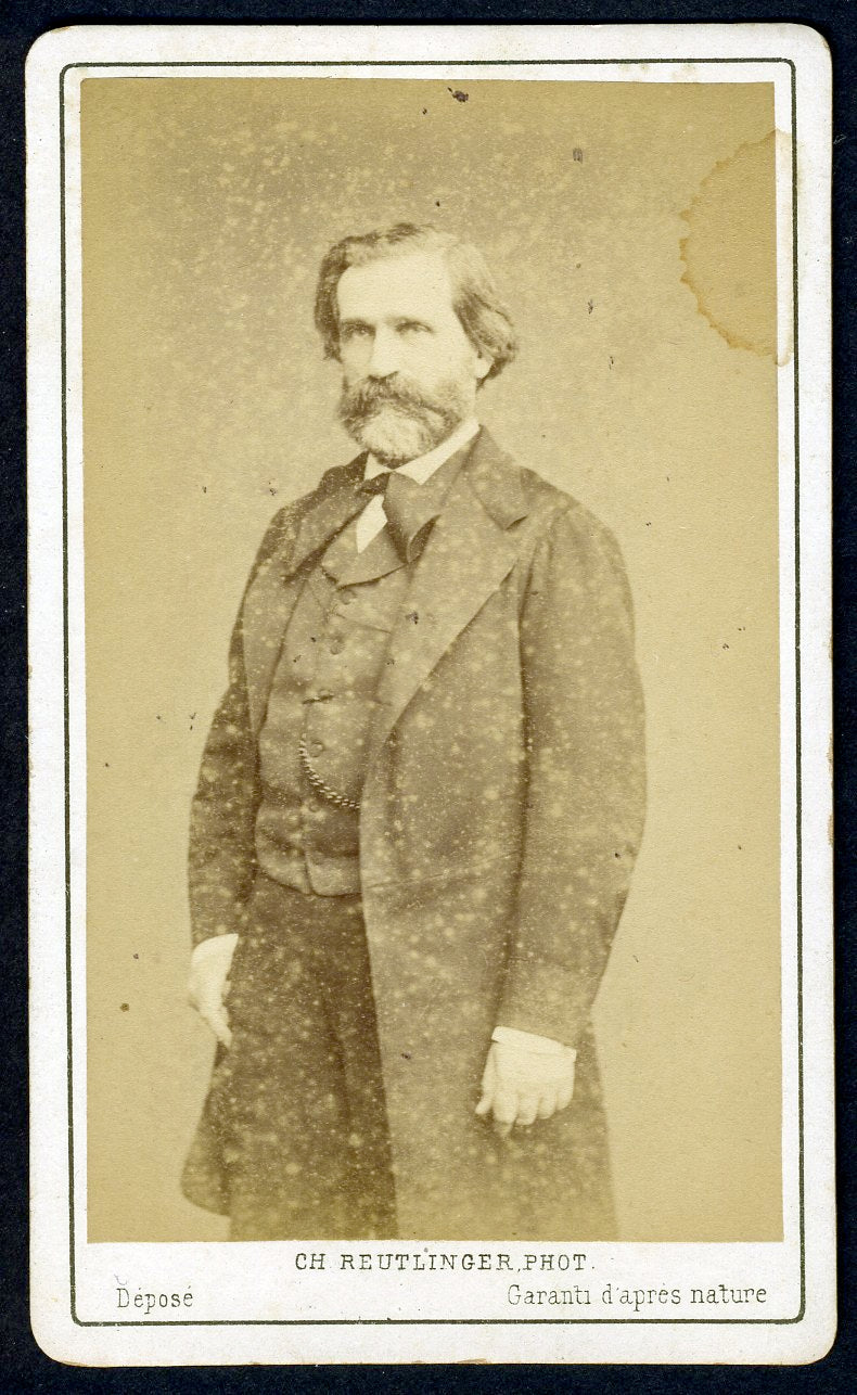 Original carte de visite photograph of the great opera composer, shown standing in a three-quarter-length portrait. Photographed by Reutlinger of Paris at the Boulevard Montmartre 21 (after 1851). Some light speckling to the image and one small water stain at the upper right; mounting remnants to verso; overall in very good condition. 2.5 x 4 inches (6.3 x 10.5 cm).