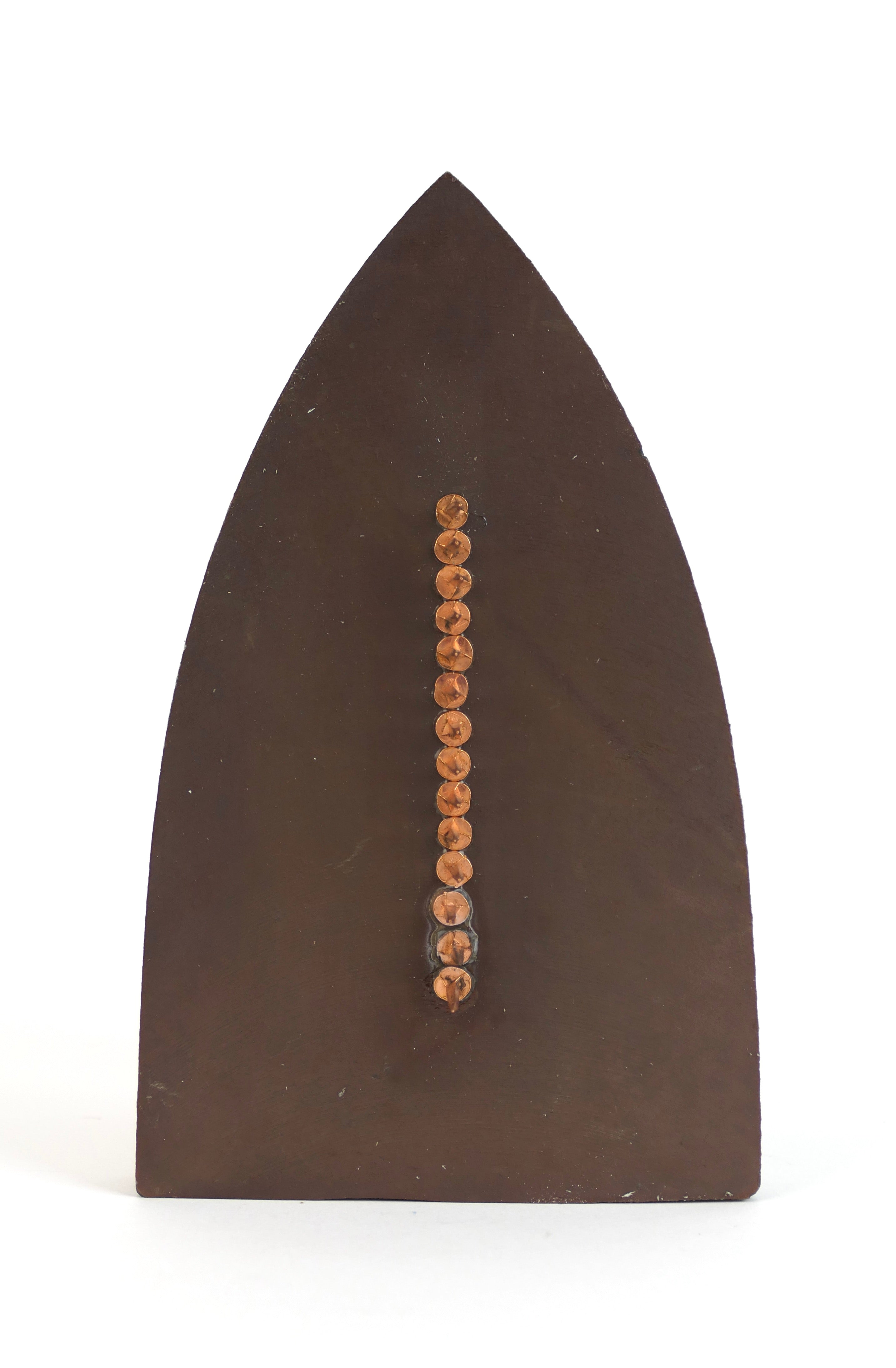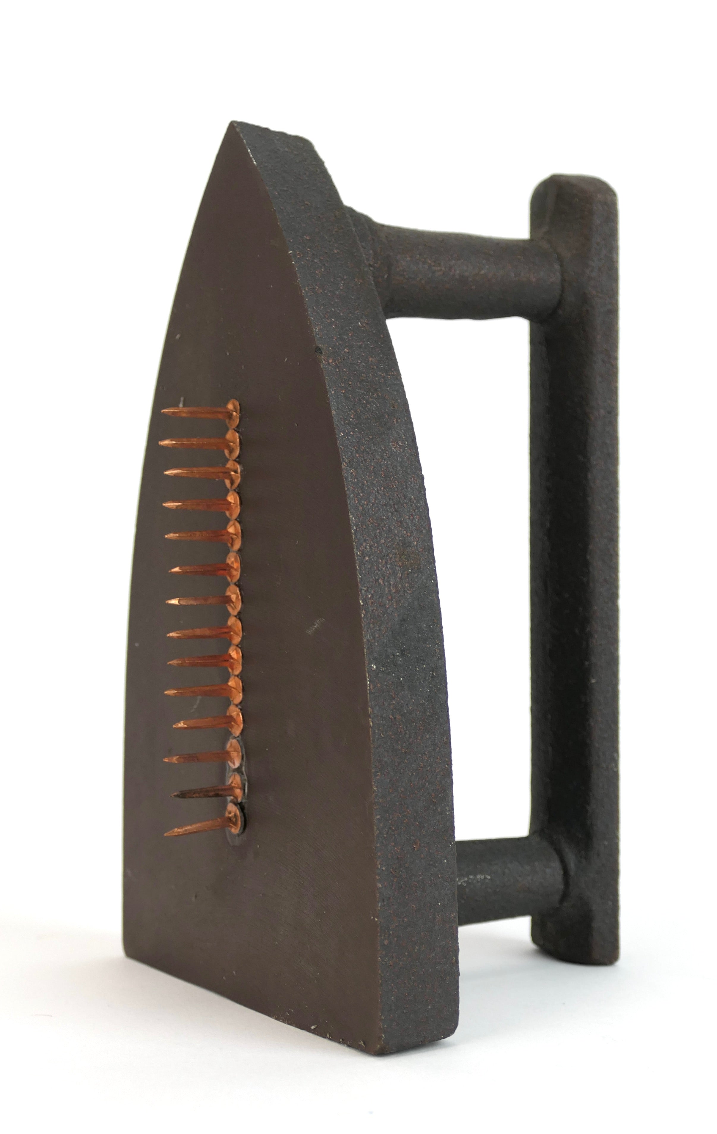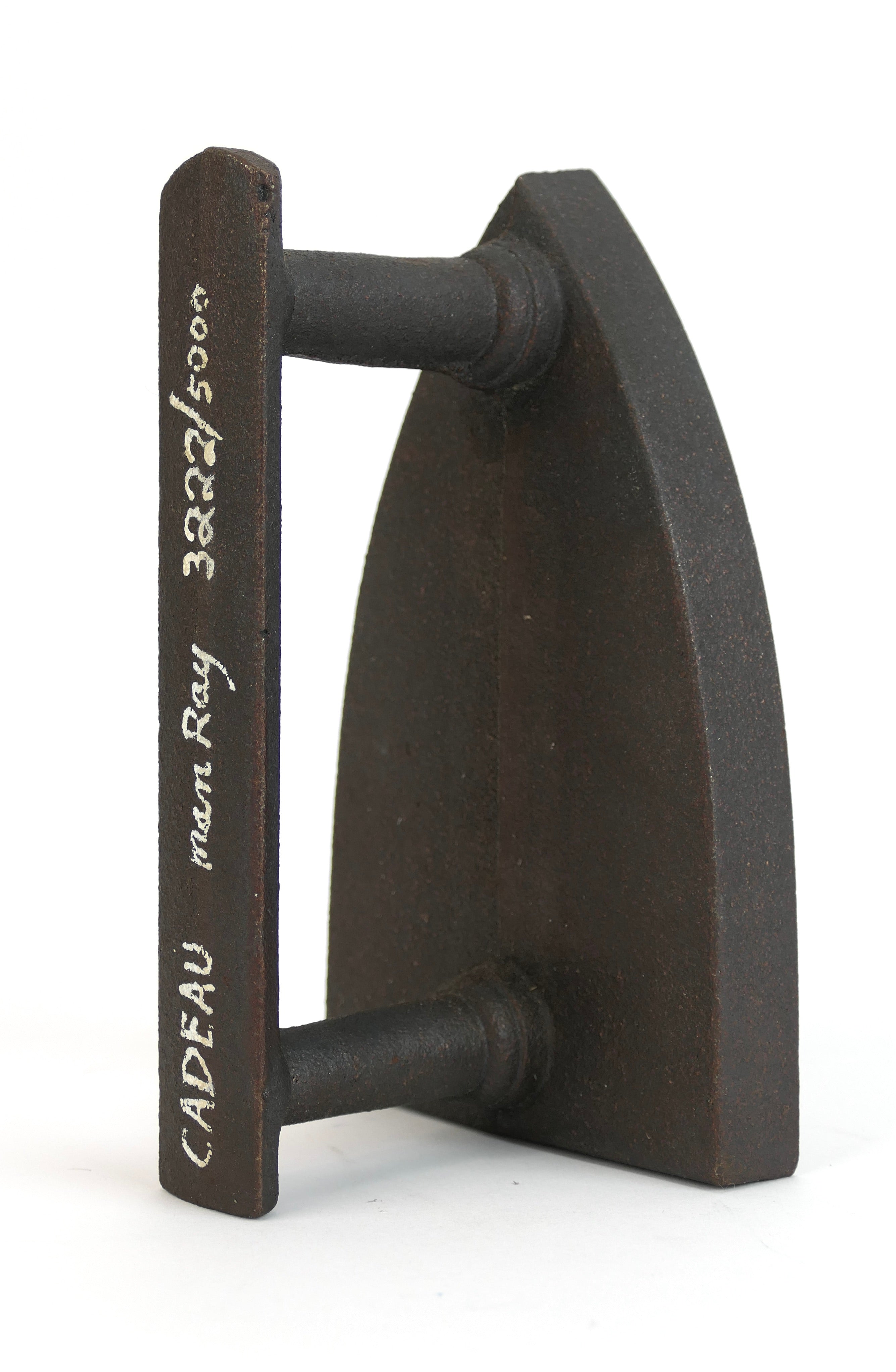 Cadeau, 1921, editioned replica 1974, or ‘Gift’, is one of the famous icons of the surrealist movement. It consists of an everyday continental flat iron of the sort that had to be heated on a stove, transformed here into a non-functional, disturbing object by the addition of a single row of fourteen nails. The transformation of an item of ordinary domestic life into a strange, unnameable object with sadistic connotations exemplified the power of the object within dada and surrealism to escape the rule of logic and the conventional identification of words and objects. Man Ray once said, "There are objects that need names."