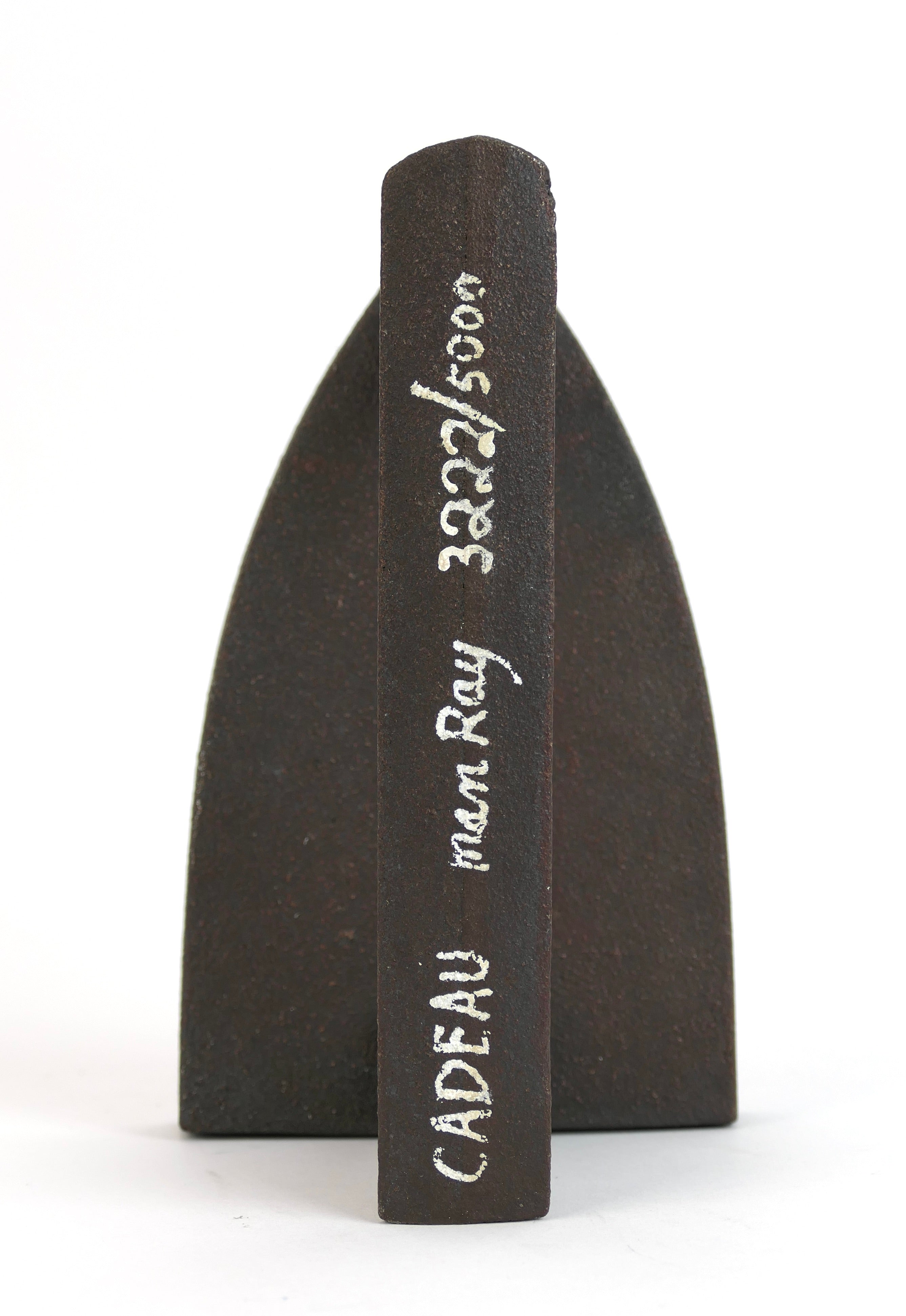 In his autobiography Man Ray recounted the story of the making of the original Cadeau. On the day of the opening of his first solo exhibition in Paris he had a drink with the composer Erik Satie and on leaving the café saw a hardware store. There with Satie’s help – Man Ray spoke only poor French at this point – he bought the iron, some glue and some nails, and went to the gallery where he made the object on the spot. He intended his friends to draw lots for the work, called ‘Cadeau’, but the piece was stolen during the course of the afternoon.