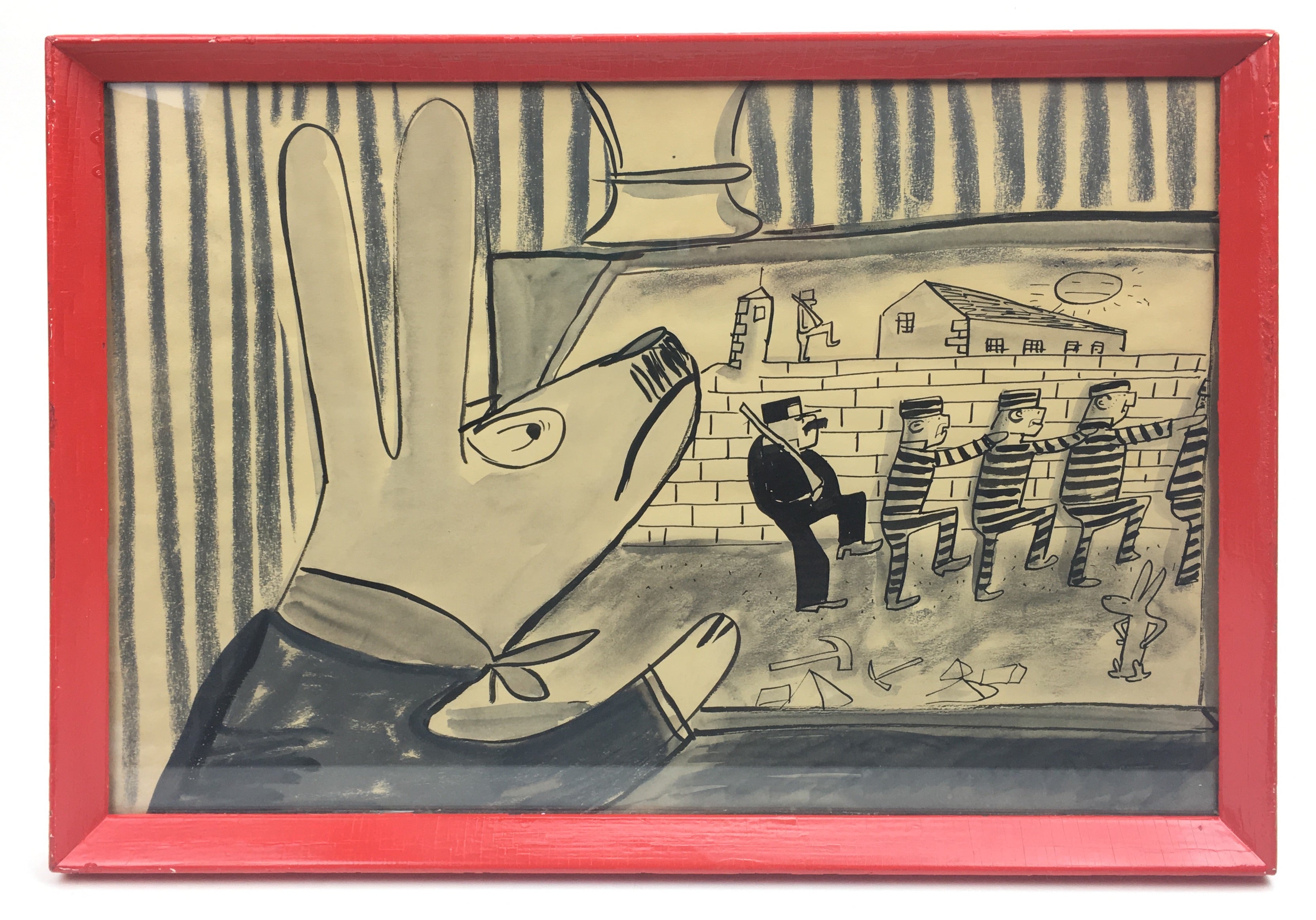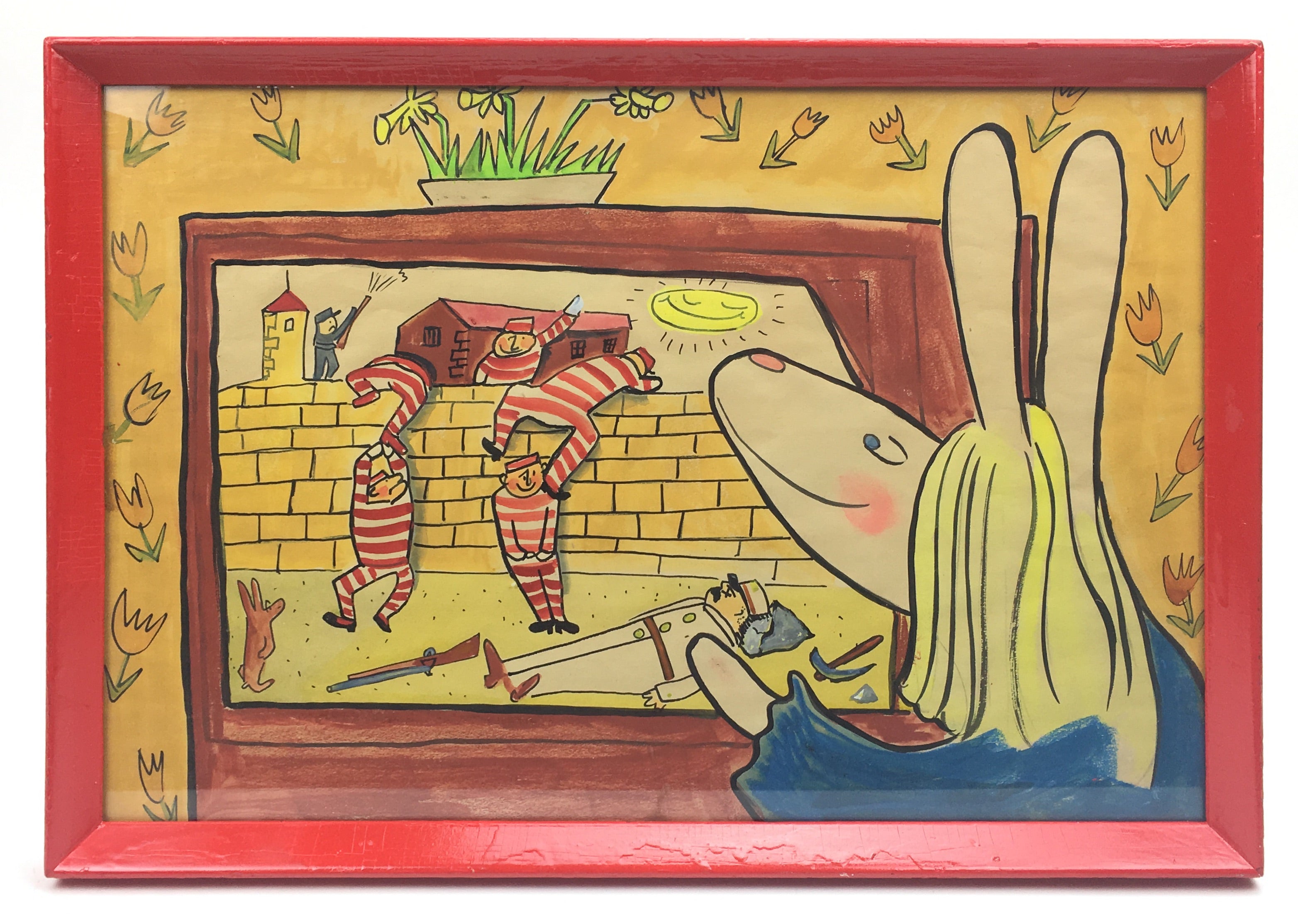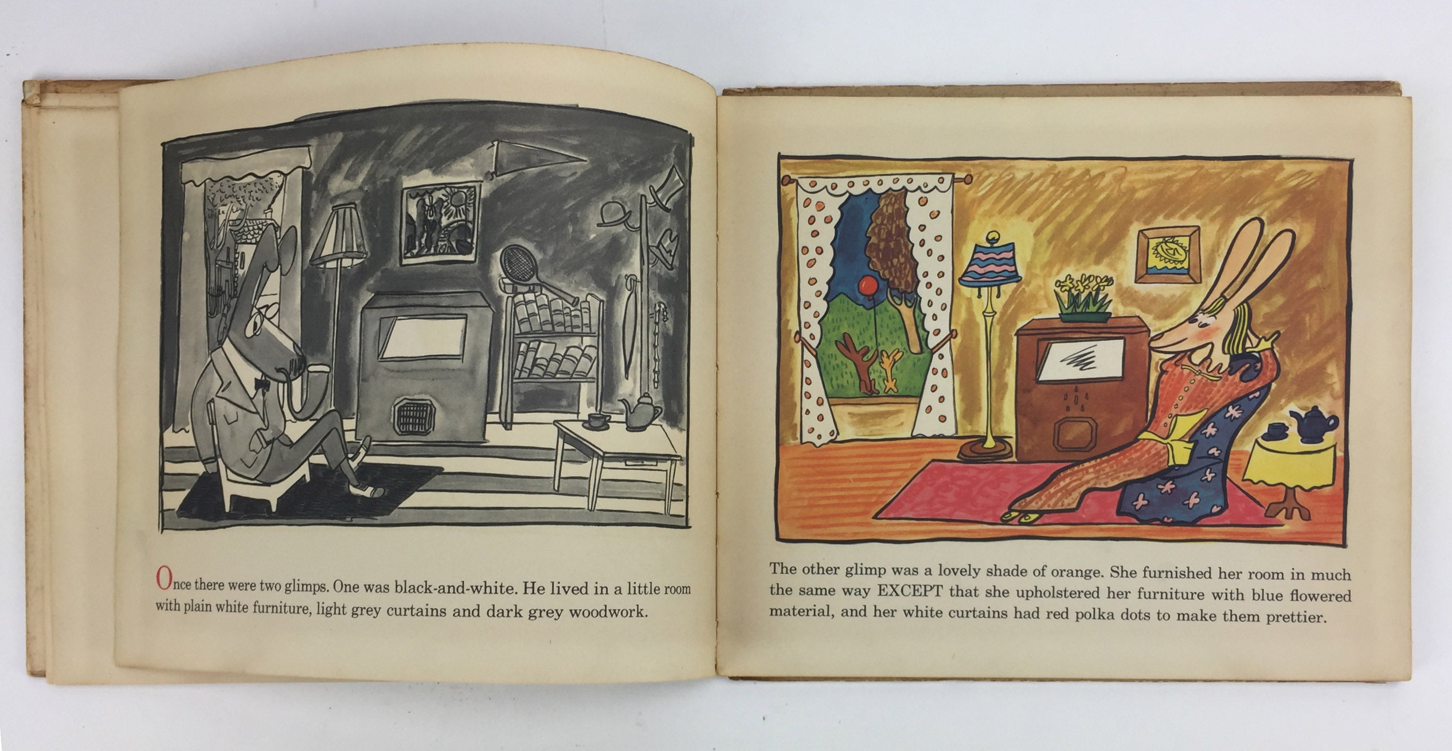 Bemelmans, Ludwig. (1898–1962). "A Tale of Two Glimps" - Two Large Original Gouaches from his 1946 Book. A remarkable pair of original gouache paintings by the Belgian-born American author and illustrator best known for his now-classic series of Madeleine children’s books. The present works, original paintings for his picture book A Tale of Two Glimps, depict an unhappy rabbit-like "Glimp" living in a black-and-white world and watching a black-and-white television, and a happier Glimp living in a color world. Each 18 x 13 inches and framed in glossy red frames, in fine condition. Together with a copy of the book (New York: Columbia Broadcasting System, [1946]); hardcover, heavily toned, with front board largely detached, protected in a mylar cover; overall good.