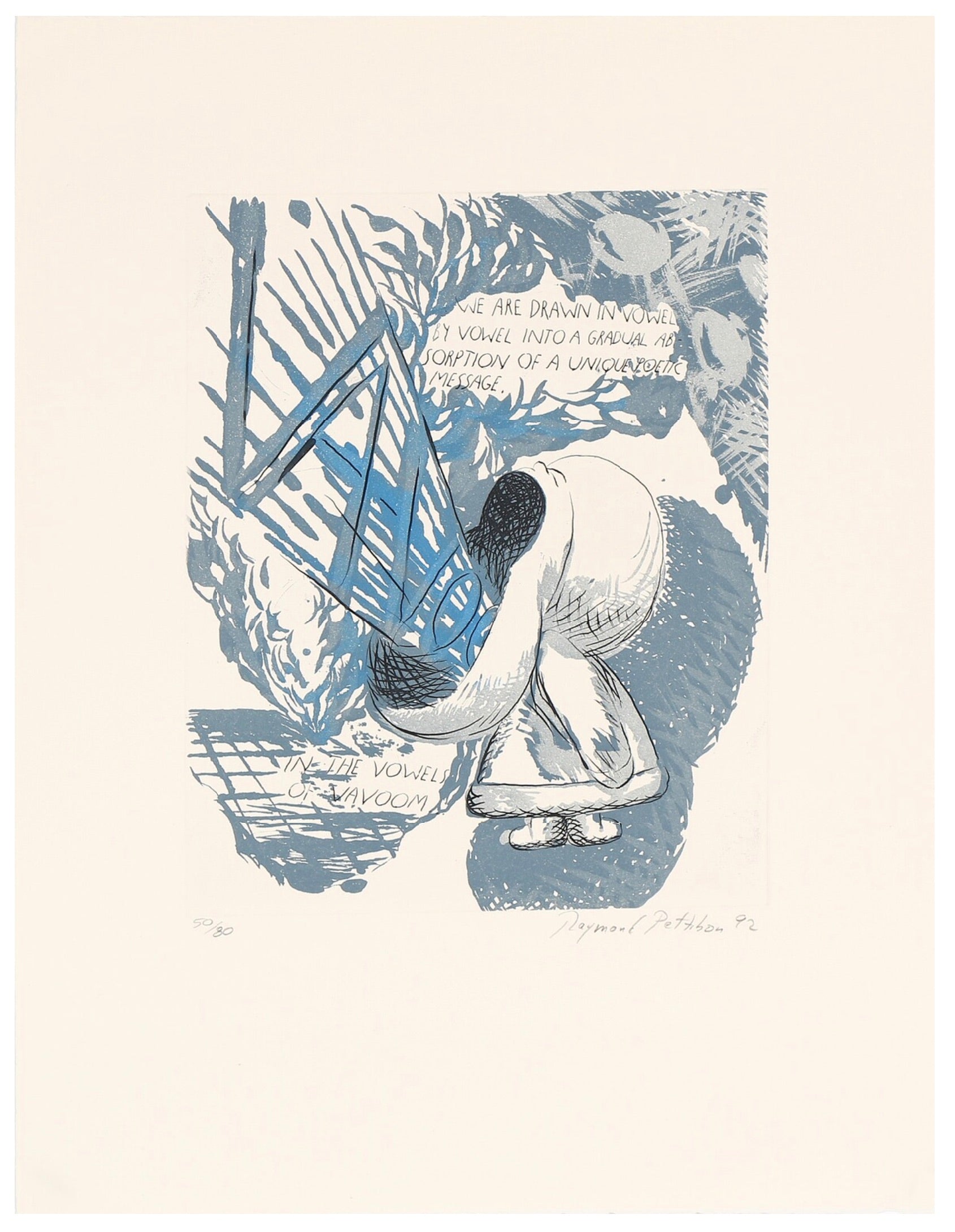"We are drawn in vowel by vowel into a gradual absorption of a unique poetic message. / In the vowels of vavoom." Etching in colors. Signed and dated at the lower right: "Raymond Petitibon 92," and numbered at the lower left: 50/80. Sheet size 20 x 25.5 inches (66 × 50 cm.) Very fine. Unframed.