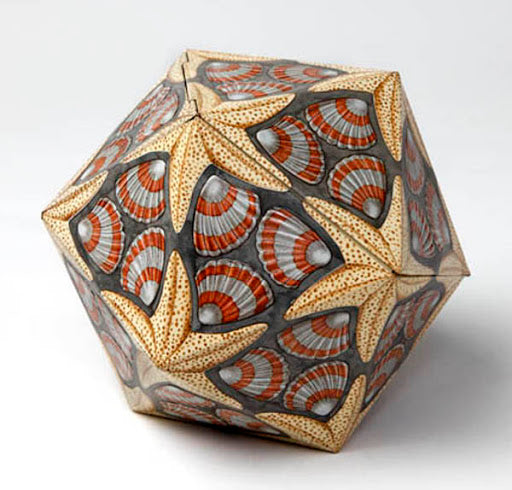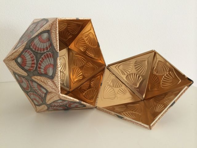 Escher, Maurits Cornelis. (1898-1972). Icosaeder (ICOSAHEDRON). Tin with 20 sides, 1963, designed by M.C. Escher for the N.V. De Vereenigde Blikfabrieken, metal, marked with artist's monogram, in very fine condition. 14 cm (each rib 9 cm). Issued in an unknown but very limited edition, only for employees of the United Tin factories on the occasion of their 75th anniversary in 1963, the multiple was filled with 450 grams of the famous Dutch chocolate Droste pastilles. Bool/Locher, p.151.