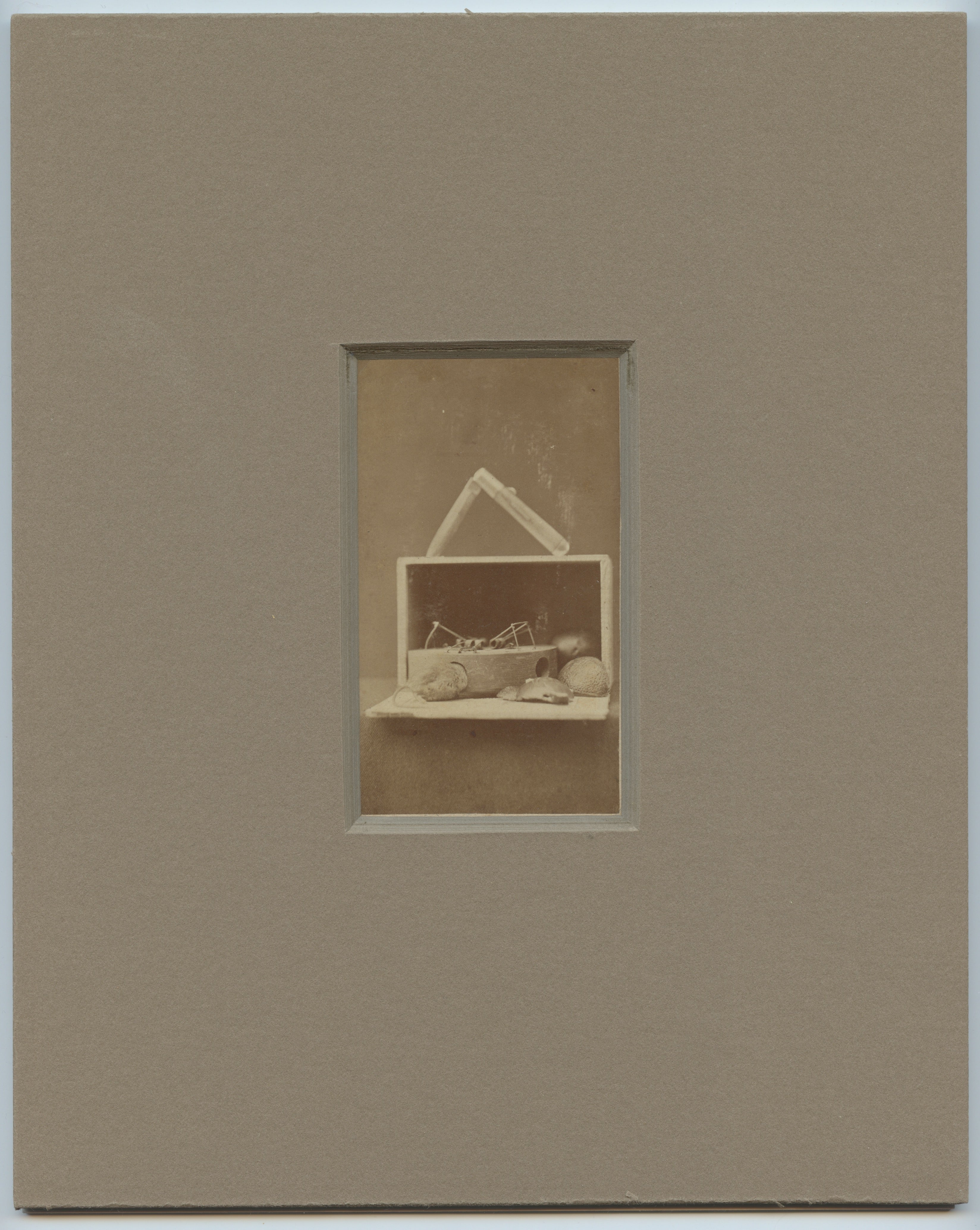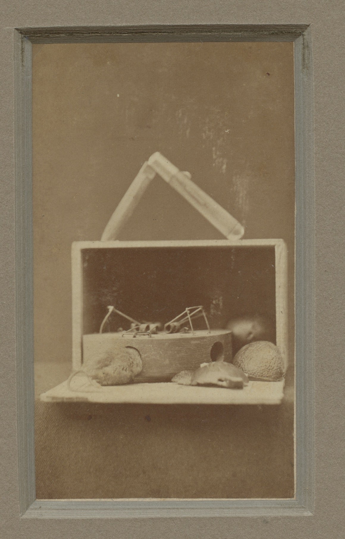 Unusual still-life carte de visite photograph, ca. 1880s, of a mouse ensnared in an intricate homemade mouse trap. The peculiar trap has been arranged in an open facing box, with an open pocket knife perched on top and adding to the somewhat threatening and surreal nature of the composition. Photographer's stamp to verso. Light scratching to surface and mild toning throughout; overall fine. Photograph 2.5 x 4.25 inches (6.35 x 10.8 cm.); matted to an overall size of 8 x 10 inches (20.3 x 25.4 cm.).