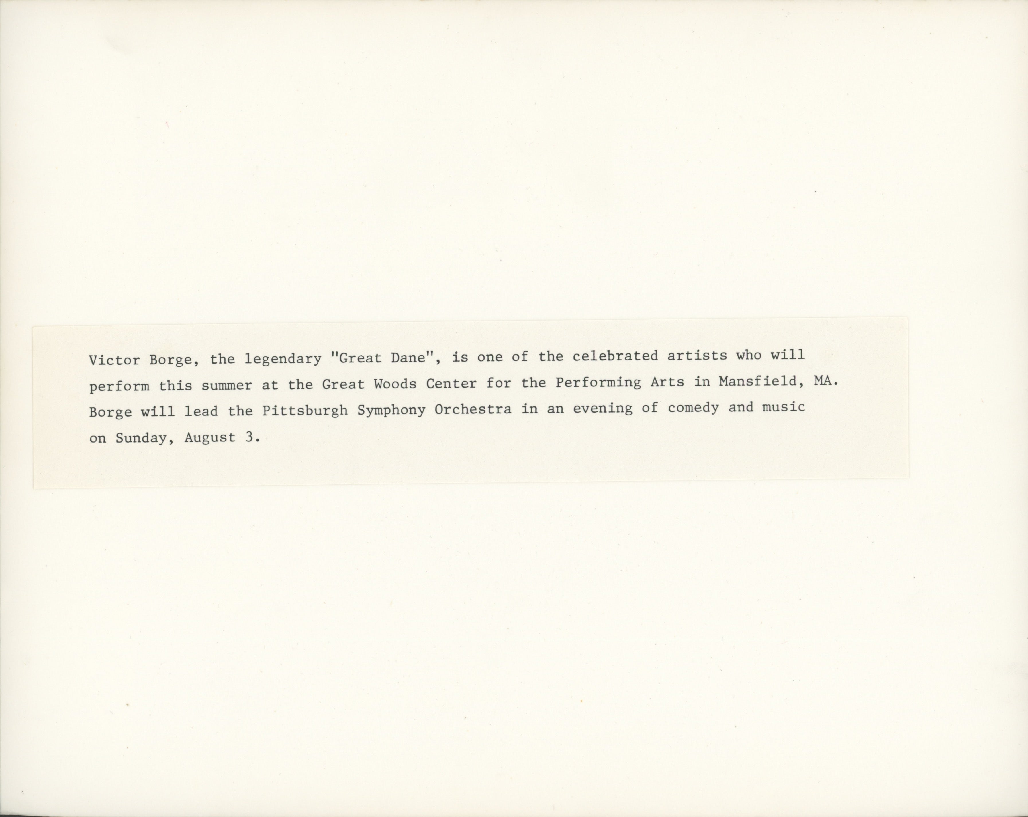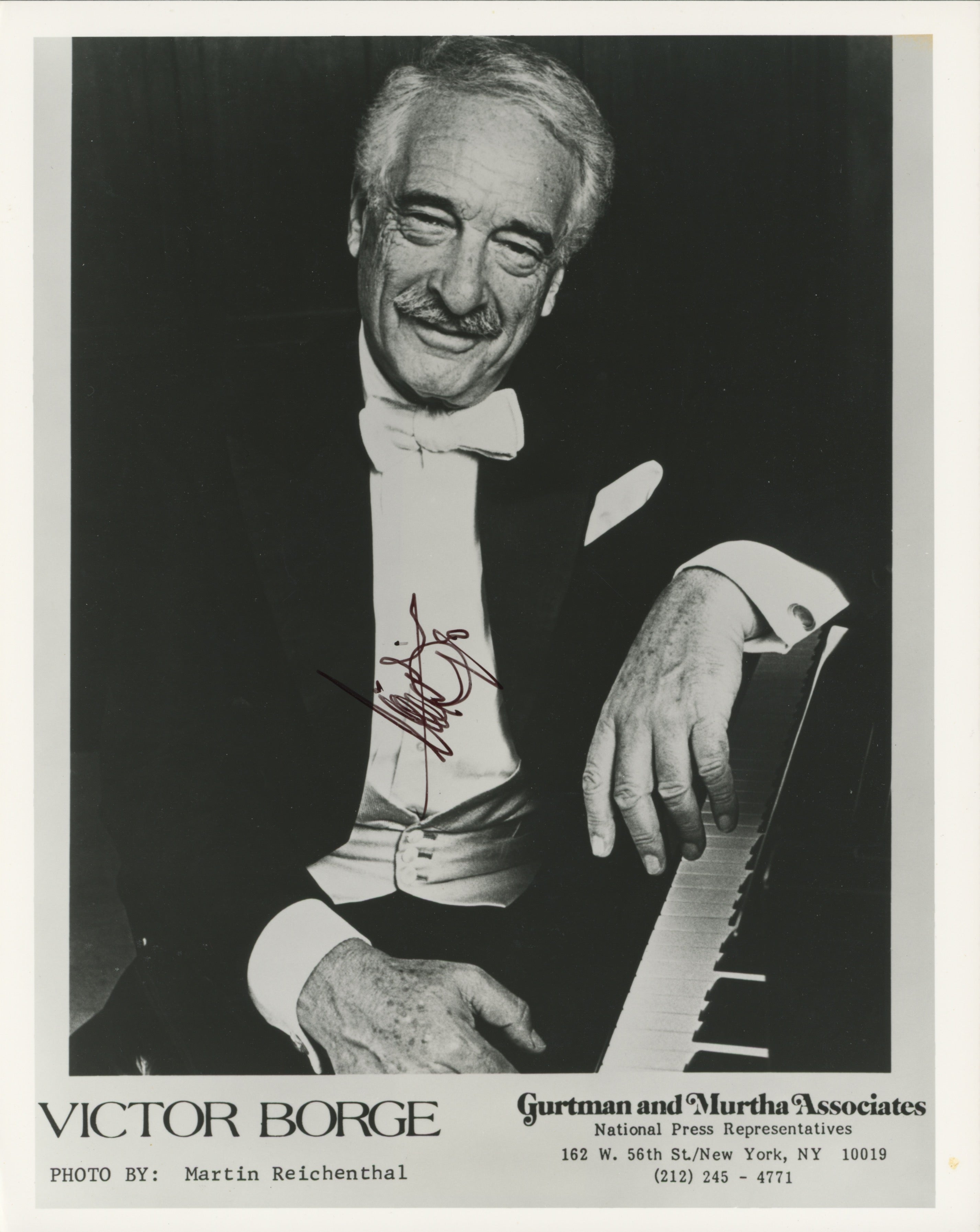 Promotional portrait photograph of the beloved pianist and comedian, who has tightly signed in black ink to the center of the image. A press note mounted to verso reads "Victor Borge, the legendary 'Great Dane,' is one of the celebrated artists who will perform this summer at the Great Woods Center for the Performing Arts in Mansfield, MA. Borge will lead the Pittsburgh Symphony Orchestra in an evening of comedy and music on Sunday, August 3." In very fine condition. 8 x 10 inches (20.3 x 25.4 cm.).