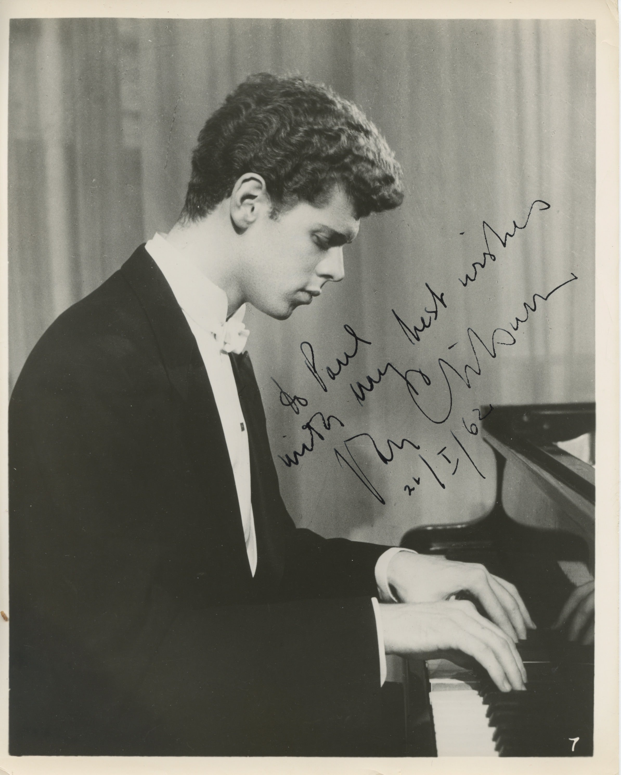 Cliburn, Van. (1934–2013). Early Signed photograph. Signed portrait of the American pianist as a young man. Inscribed to Paul McMahon on January 21, 1962. Handstamp, "Sol Hurok presents Van Cliburn, Pianist..." to verso. 10 x 8 inches (25.5 x 20.3 cm). Edges slightly worn; else in fine condition.