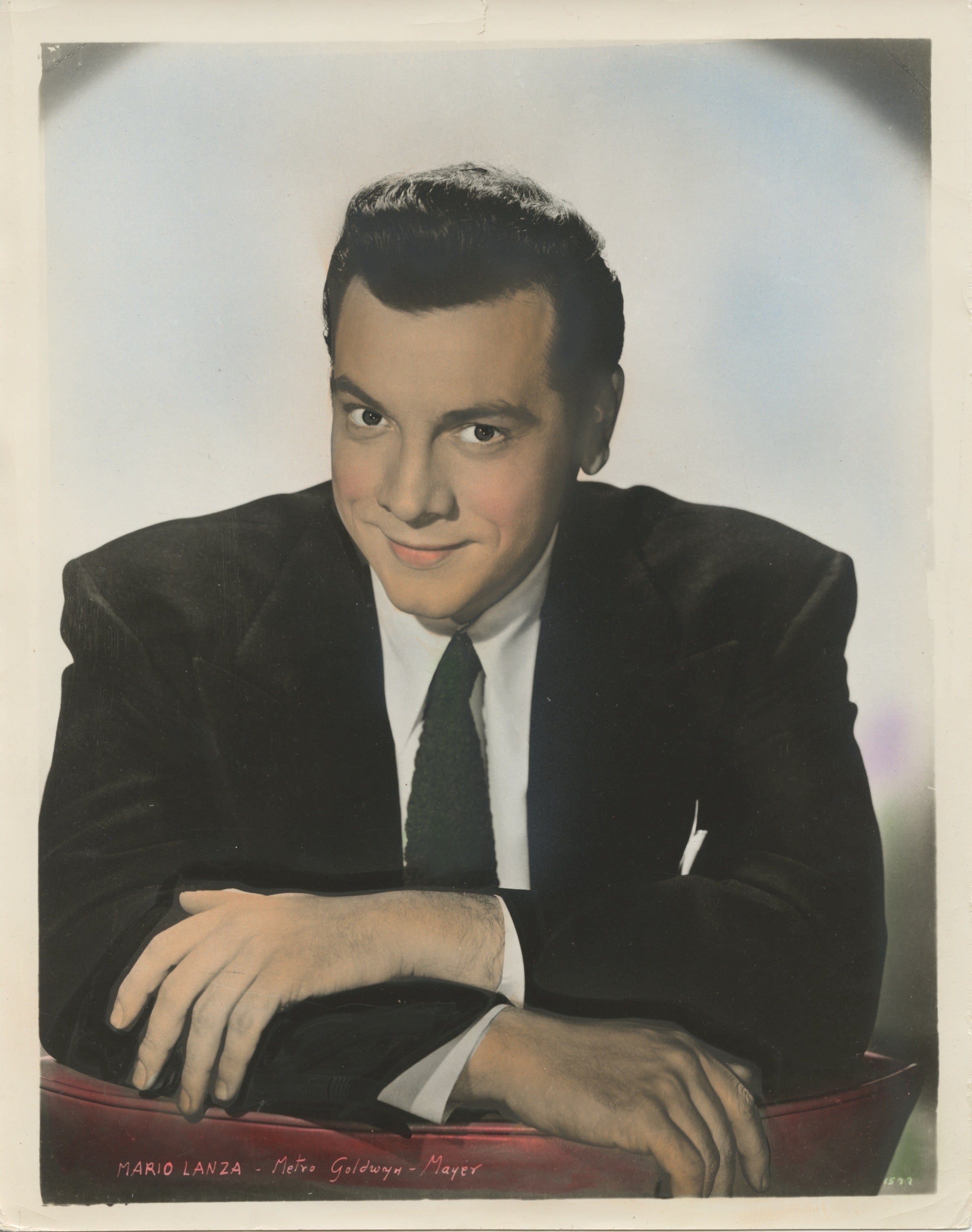 Unusual period colorized Metro Goldwyn Mayer promotional photograph of the handsome tenor and screen star. Small tears and creases to corners, else fine. 8 x 10 inches.