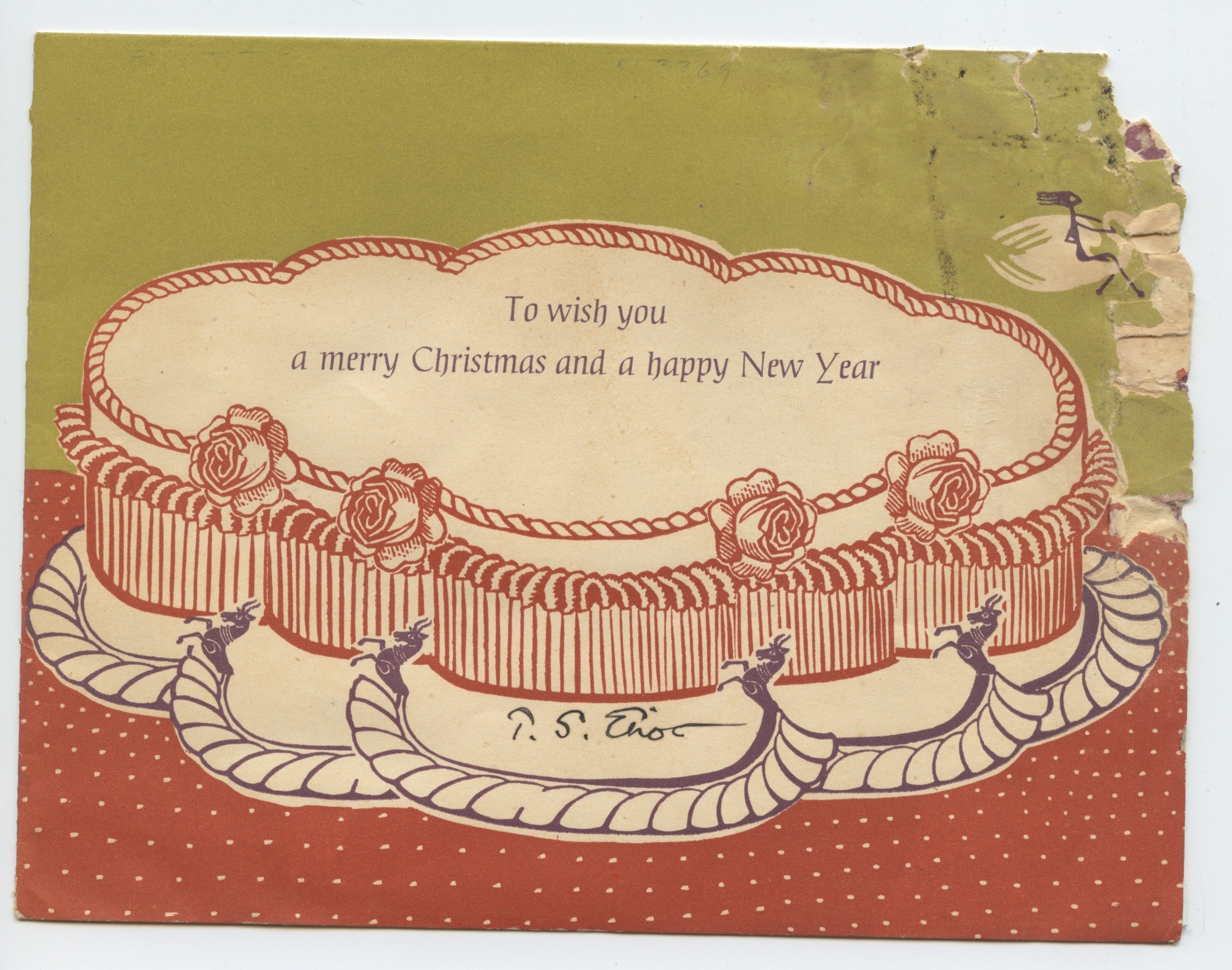 Folded four-panel Christmas card designed by Edward Bawden as part of the holiday card series commissioned by Faber & Faber from 1945 until 1965, this example depicting a lively table tableaux, each panel 7.5 x 5.75 inches (19 x 14.5 cm), signed on the front image of a cake in ink "T. S. Eliot.” Losses and staining the upper right corner, else fine. A most unusual and visually striking item from the eminent American-born British writer, winner of the 1948 Nobel Prize in Literature.