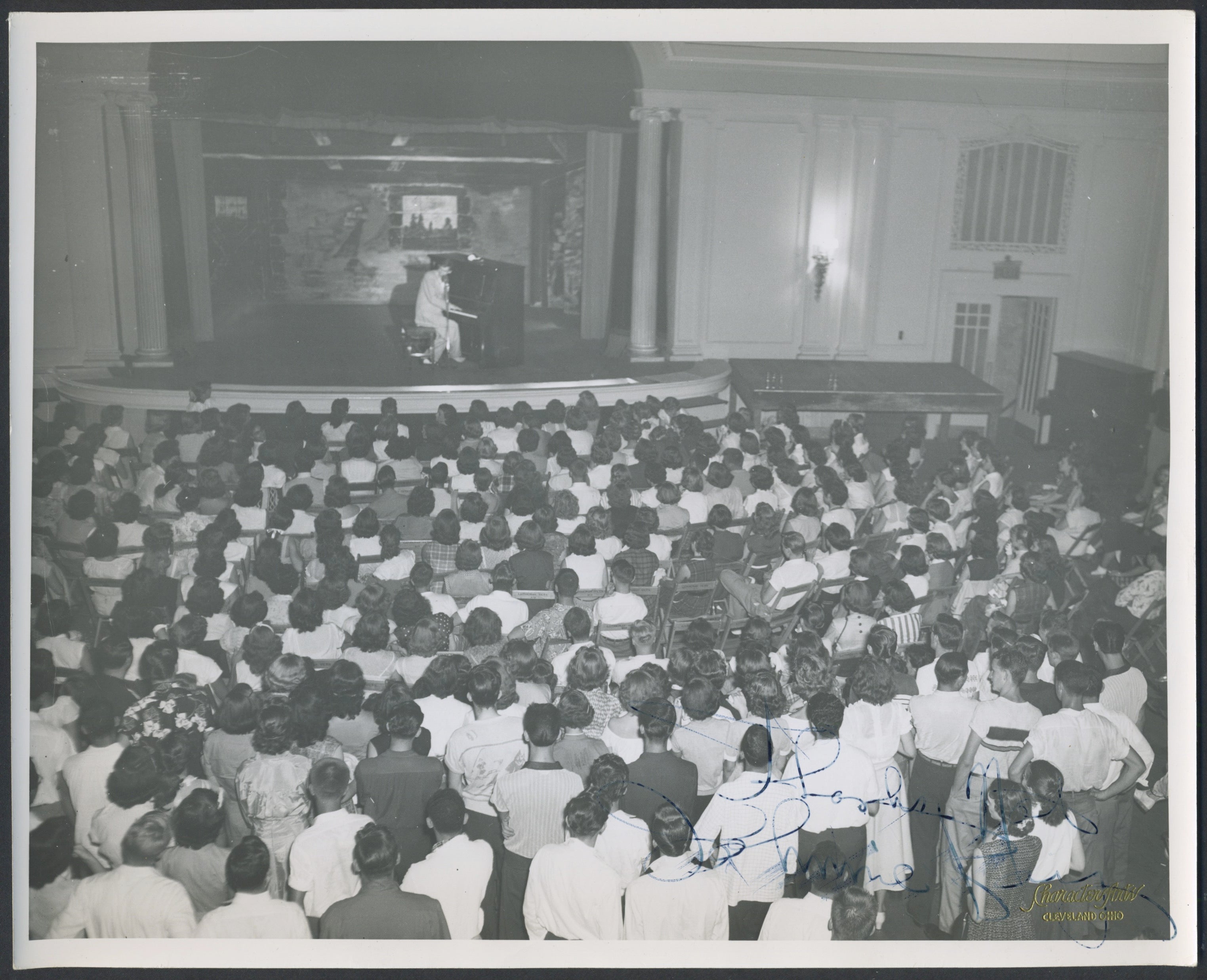Signed photograph from the American pop singer and pianist, a 1950's sensation who was an important precursor to rock and roll stars. Ray is shown performing at the piano for an audience of teenage girls, photographed from above, and has signed and inscribed the photo to photographer Nat Singerman. Rather poor contrast and some smudging to the signature, but overall in fine condition. 10 x 8 inches (25.3 x 20.6 cm).
