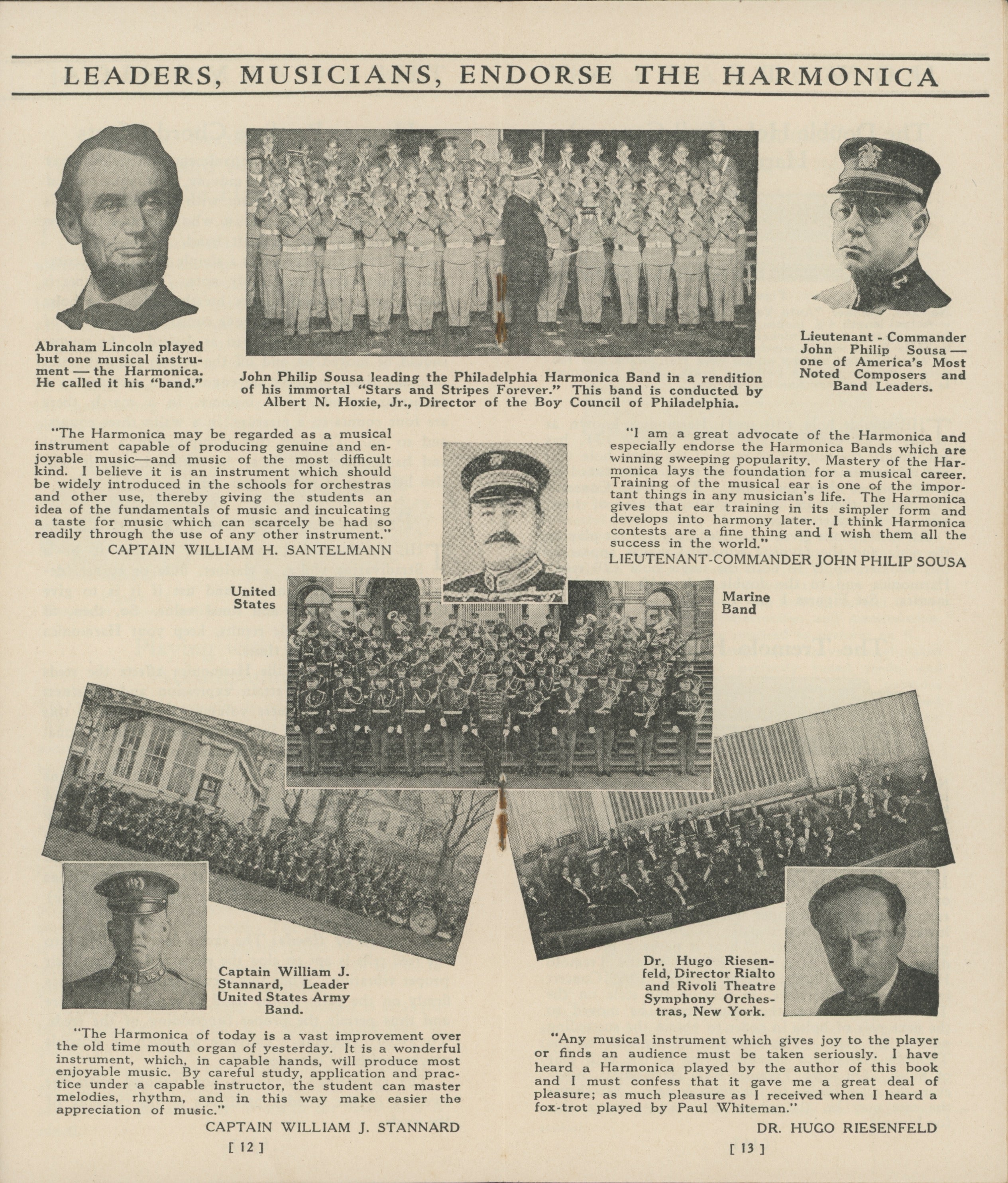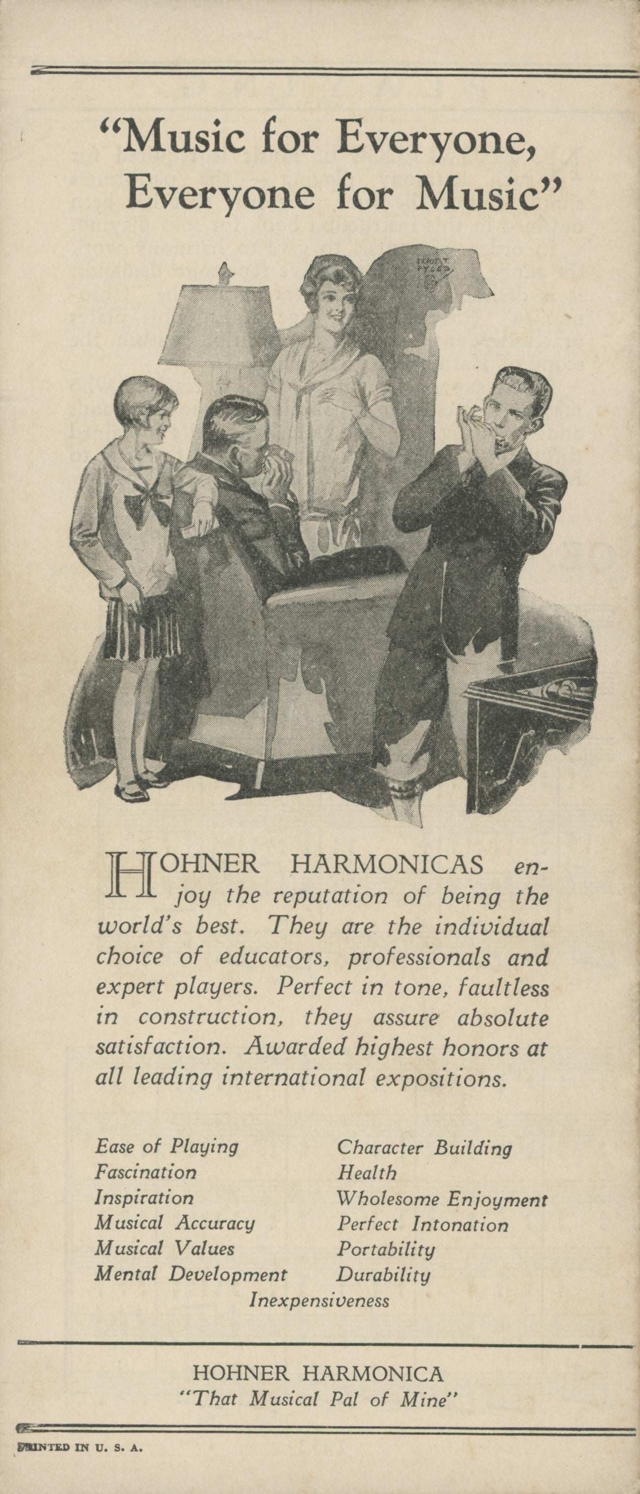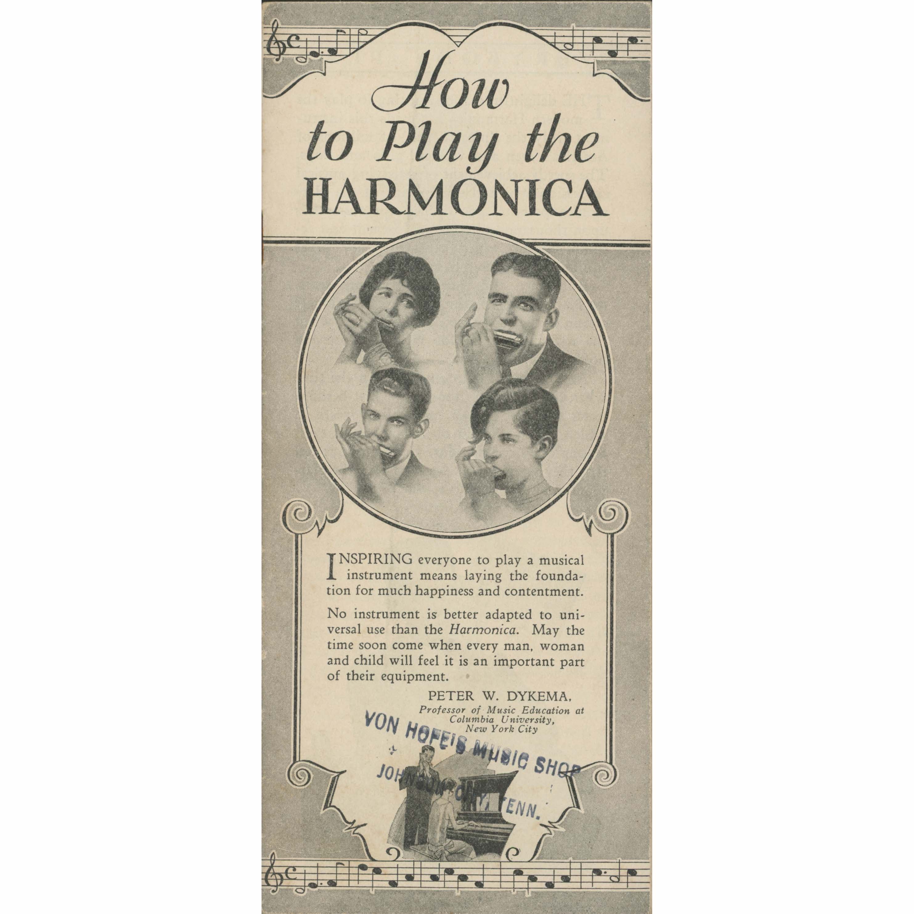 Instructional booklet on how to play the harmonica, sold by Von Hofe's Music Shop in Johnson City, Tennessee. The booklet includes instruction on various techniques, several short pieces for the instrument, historical information ("Abraham Lincoln played but one instrument—the harmonica. He called it his 'band.'"), and a guide to the different types of harmonica that exist. 24 pp. In fine condition. 3.5 x 8.25 inches (8.9 x 21 cm.).
