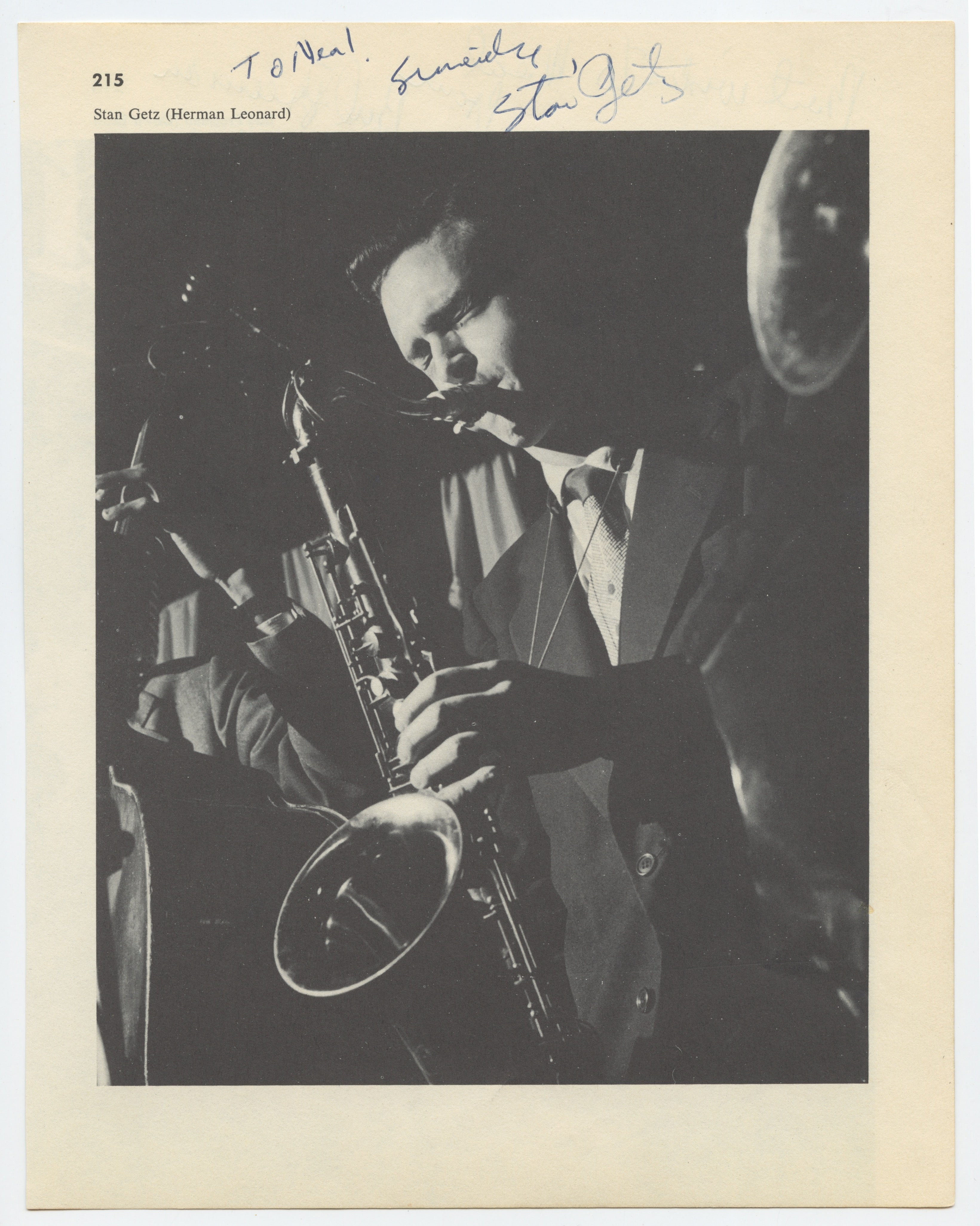 Pair of signed halftone photographs of the jazz musicians, printed to opposing sides of a single sheet which has been trimmed from either a paperstock book or program. Getz has inscribed "To Neal / Sincerely, / Stan Getz" to the upper margin of a photograph by American photographer Herman Leonard, and Freeman has inscribed "Best wishes to Neal / from / Bud Freeman." In fine condition. 7.75 x 10 inches (19.7 x 25.4 cm.).