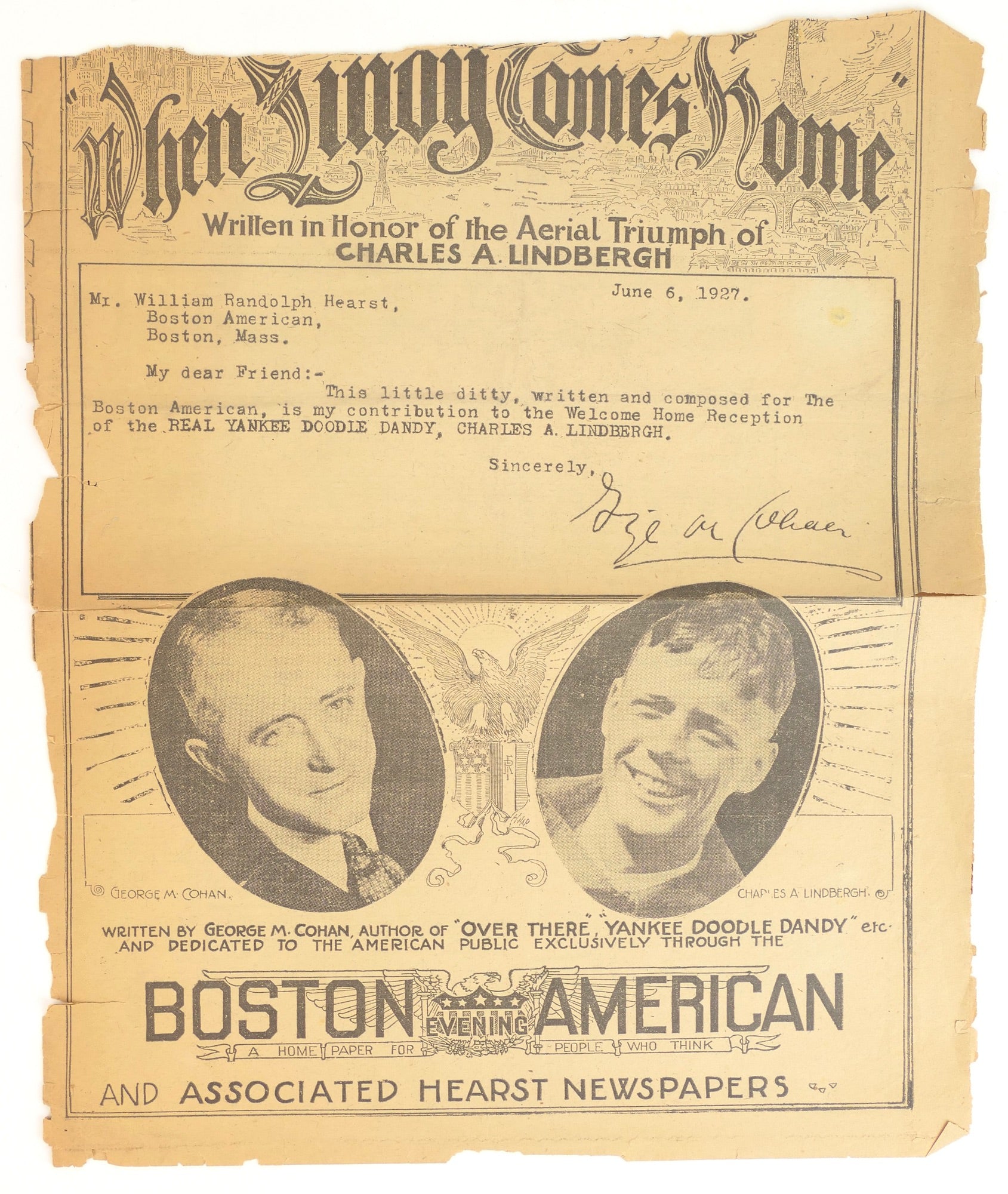 Title with facsimile of a typed letter from the composer to "William Randolph Hearst, Boston American, Boston, Mass.," dated June 6, 1927. In full: "My dear Friend: This little ditty, written and composed for The Boston American, is my contribution to the Welcome Home Reception of the REAL YANKEE DOODLE DANDY, CHARLES A. LINDBERGH. Sincerely, Gge M Cohen." Photographs of Cohan and Lindbergh to lower half of title, followed by note, "Written by George M. Cohan, author of 'Over There,' 'Yankee Doodle Dandy,' et. and dedicated to the the American public exclusively though the Boston Evening American [tagline:] A home paper for people who think and Associated Hearst Newspapers."