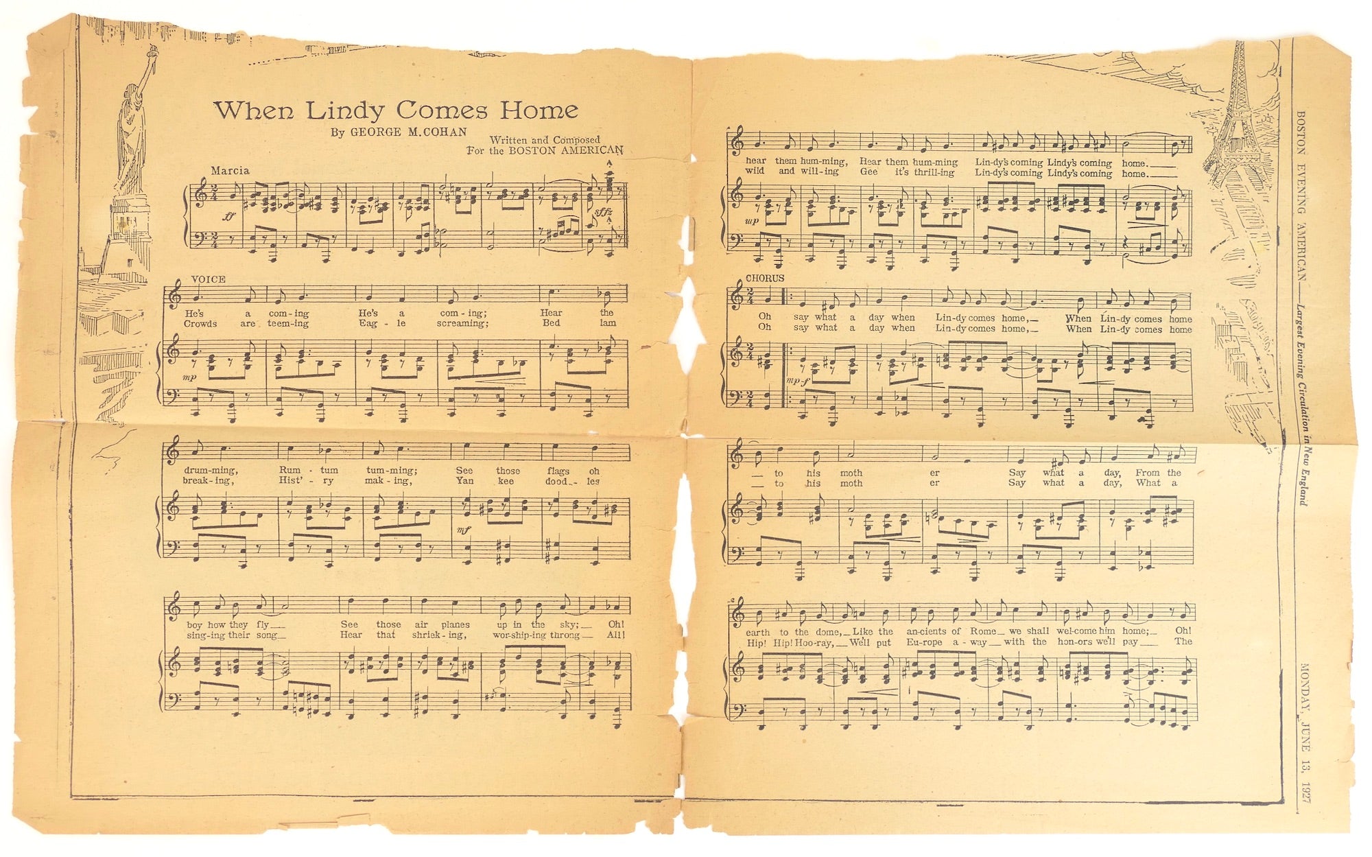 The song, a march in C major, scored for voice and piano, is printed on the three remaining pages. It has two strophes, both presented as text underlay. The chorus is patriotic: "Oh say what a day / When Lindy comes home to his mother... / From the earth to the dome, /Like the Ancients of Rome we shall welcome him home. / Oh! wait and see America rise, /With One, Two, Three, Fourth Of Julys; / Oh! say what a day / From Gotham to Nome / When Lindy comes back / From across the foam / To his home / Sweet home." 14 x 10.75 inches (27.5 x 34 cm). Horizontal fold. Browned, frayed and very brittle; head of both leaves torn off.